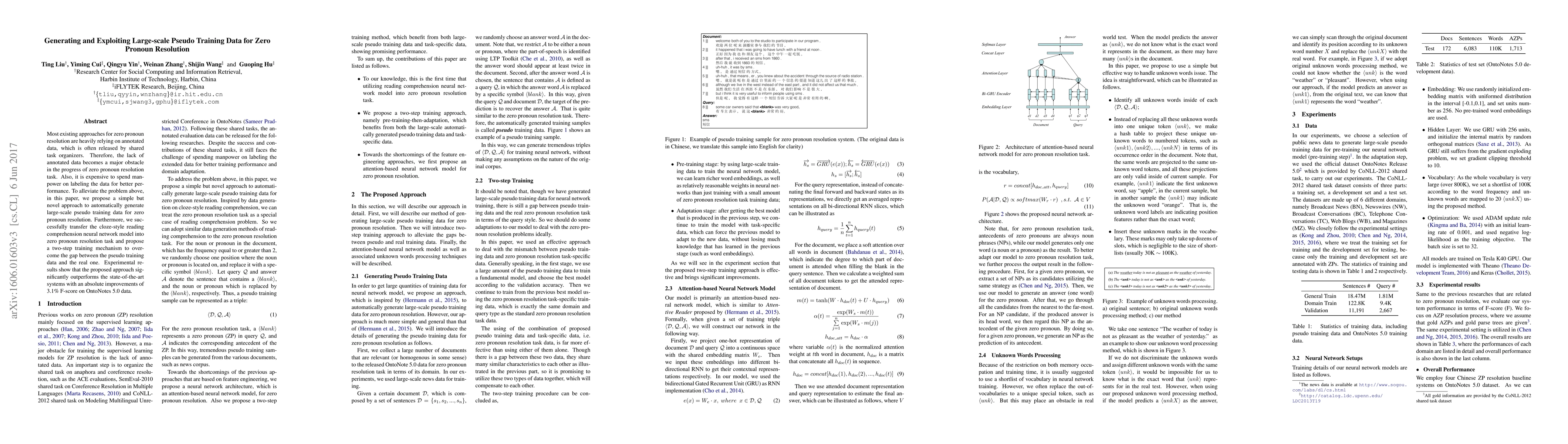 This paper proposes an innovative method to generate large-scale pseudo training data for zero pronoun resolution, addressing the lack of annotated data. It introduces a two-step training mechanism to bridge the gap between pseudo and real data, achieving a 3.1% improvement in F-score over existing methods on OntoNotes 5.0 data.