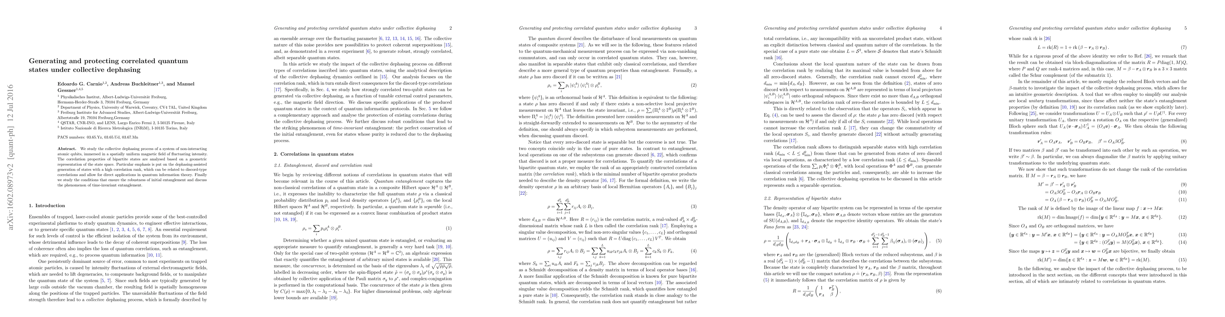 We study the collective dephasing process of a system of non-interacting atomic qubits, immersed in a spatially uniform magnetic field of fluctuating intensity. The correlation properties of bipartite states are analysed based on a geometric representation of the state space. Particular emphasis is put on the dephasing-assisted generation of states with a high correlation rank, which can be related to discord-type correlations and allow for direct applications in quantum information theory. Finally we study the conditions that ensure the robustness of initial entanglement and discuss the phenomenon of time-invariant entanglement.