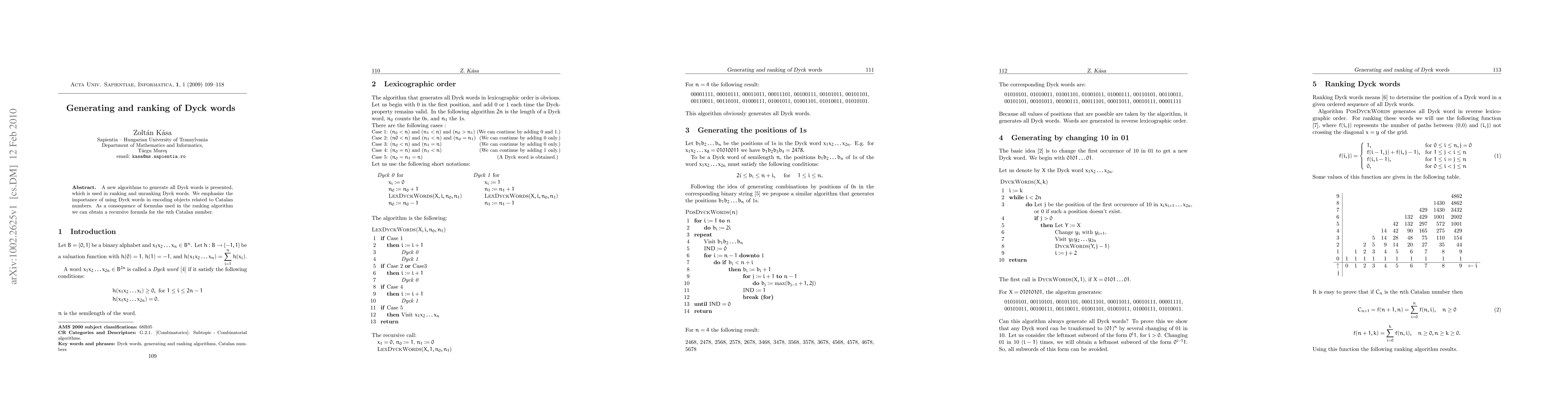 Summary: This paper introduces a novel algorithm for generating and ranking Dyck words, emphasizing their role in encoding objects related to Catalan numbers, and derives a recursive formula for the nth Catalan number from the ranking algorithm.