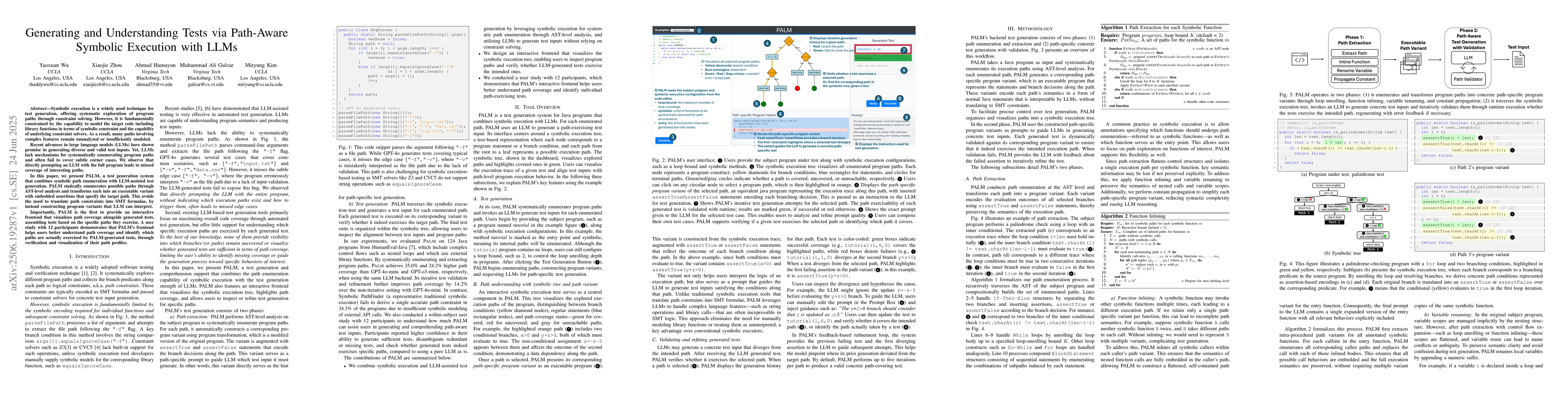 Symbolic execution is a widely used technique for test generation, offering systematic exploration of program paths through constraint solving. However, it is fundamentally constrained by the capability to model the target code including library functions in terms of symbolic constraint and the capability of underlying constraint solvers. As a result, many paths involving complex features remain unanalyzed or insufficiently modeled. Recent advances in large language models (LLMs) have shown promise in generating diverse and valid test inputs. Yet, LLMs lack mechanisms for systematically enumerating program paths and often fail to cover subtle corner cases. We observe that directly prompting an LLM with the full program leads to missed coverage of interesting paths. In this paper, we present PALM, a test generation system that combines symbolic path enumeration with LLM-assisted test generation. PALM statically enumerates possible paths through AST-level analysis and transforms each into an executable variant with embedded assertions that specify the target path. This avoids the need to translate path constraints into SMT formulae, by instead constructing program variants that LLM can interpret. Importantly, PALM is the first to provide an interactive frontend that visualizes path coverage alongside generated tests, assembling tests based on the specific paths they exercise. A user study with 12 participants demonstrates that PALM's frontend helps users better understand path coverage and identify which paths are actually exercised by PALM-generated tests, through verification and visualization of their path profiles.
