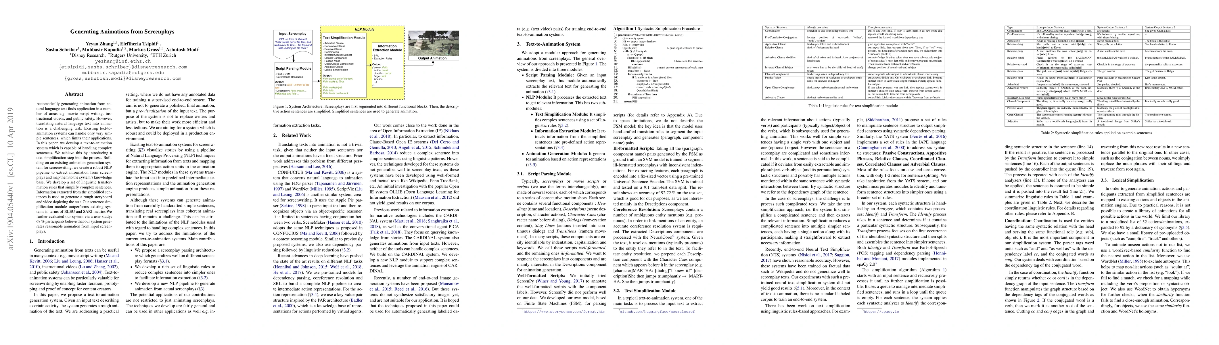 This paper presents a text-to-animation system that simplifies complex sentences to generate animations from screenplays, outperforming existing systems in metrics and receiving positive feedback in a user study. The system uses a robust NLP pipeline and linguistic transformation rules to create storyboards and animations.