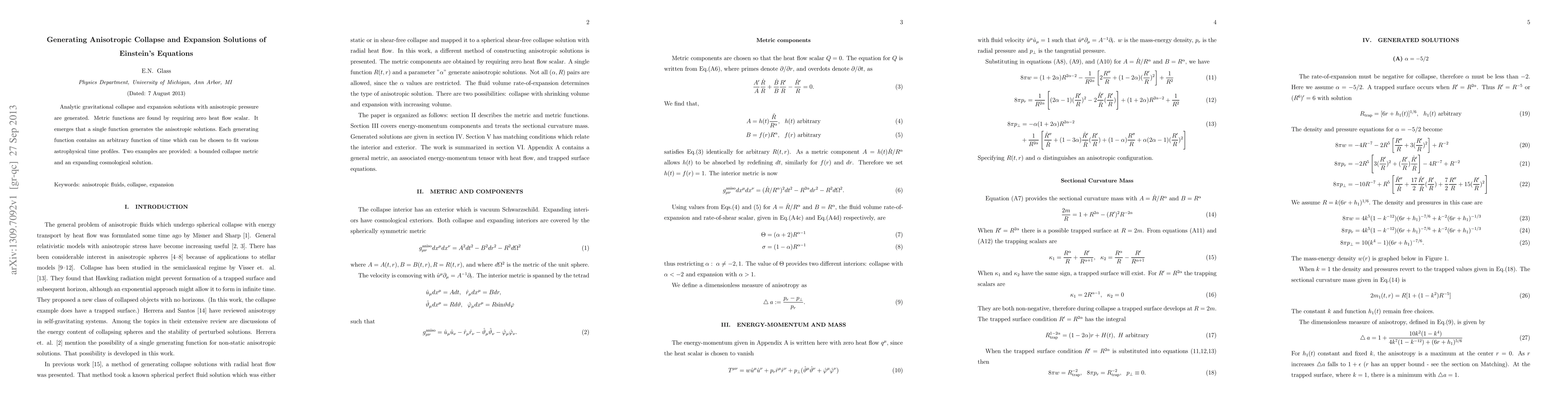 Analytic gravitational collapse and expansion solutions with anisotropic pressure are generated. Metric functions are found by requiring zero heat flow scalar. It emerges that a single function generates the anisotropic solutions. Each generating function contains an arbitrary function of time which can be chosen to fit various astrophysical time profiles. Two examples are provided: a bounded collapse metric and an expanding cosmological solution