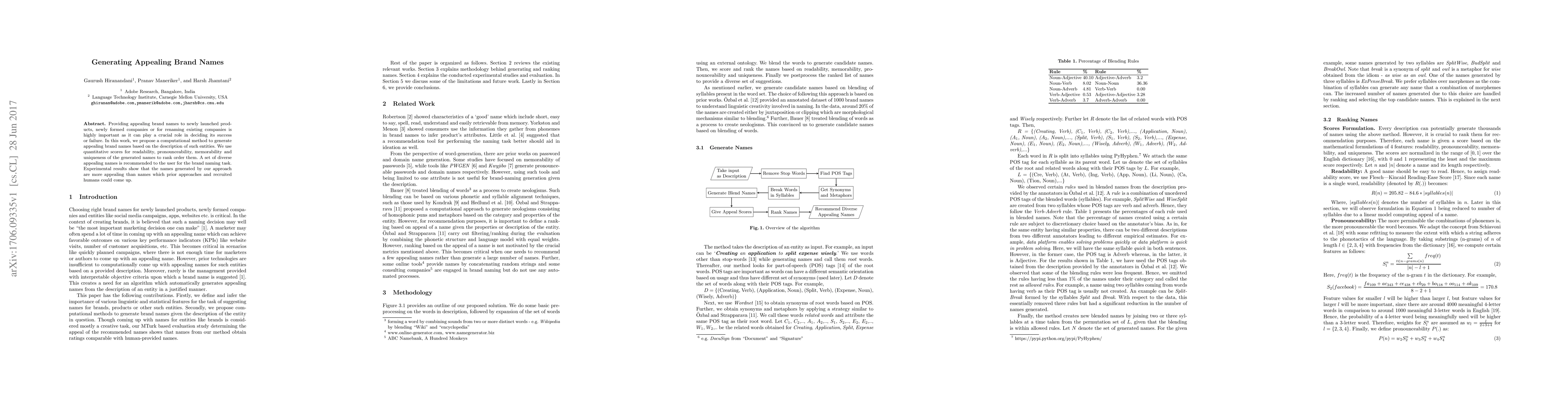 This research introduces a computational method to generate appealing brand names, using quantitative scores for readability, pronounceability, memorability, and uniqueness. Experiments demonstrate that the generated names outperform those from prior methods and human-generated names.