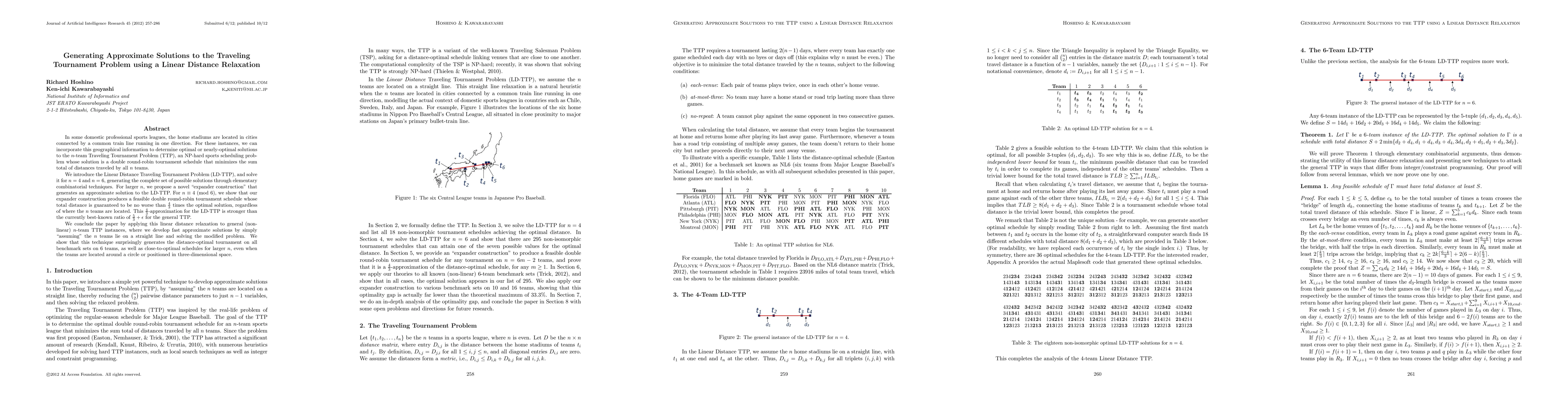 In some domestic professional sports leagues, the home stadiums are located in cities connected by a common train line running in one direction. For these instances, we can incorporate this geographical information to determine optimal or nearly-optimal solutions to the n-team Traveling Tournament Problem (TTP), an NP-hard sports scheduling problem whose solution is a double round-robin tournament schedule that minimizes the sum total of distances traveled by all n teams. We introduce the Linear Distance Traveling Tournament Problem (LD-TTP), and solve it for n=4 and n=6, generating the complete set of possible solutions through elementary combinatorial techniques. For larger n, we propose a novel "expander construction" that generates an approximate solution to the LD-TTP. For n congruent to 4 modulo 6, we show that our expander construction produces a feasible double round-robin tournament schedule whose total distance is guaranteed to be no worse than 4/3 times the optimal solution, regardless of where the n teams are located. This 4/3-approximation for the LD-TTP is stronger than the currently best-known ratio of 5/3 + epsilon for the general TTP. We conclude the paper by applying this linear distance relaxation to general (non-linear) n-team TTP instances, where we develop fast approximate solutions by simply "assuming" the n teams lie on a straight line and solving the modified problem. We show that this technique surprisingly generates the distance-optimal tournament on all benchmark sets on 6 teams, as well as close-to-optimal schedules for larger n, even when the teams are located around a circle or positioned in three-dimensional space.