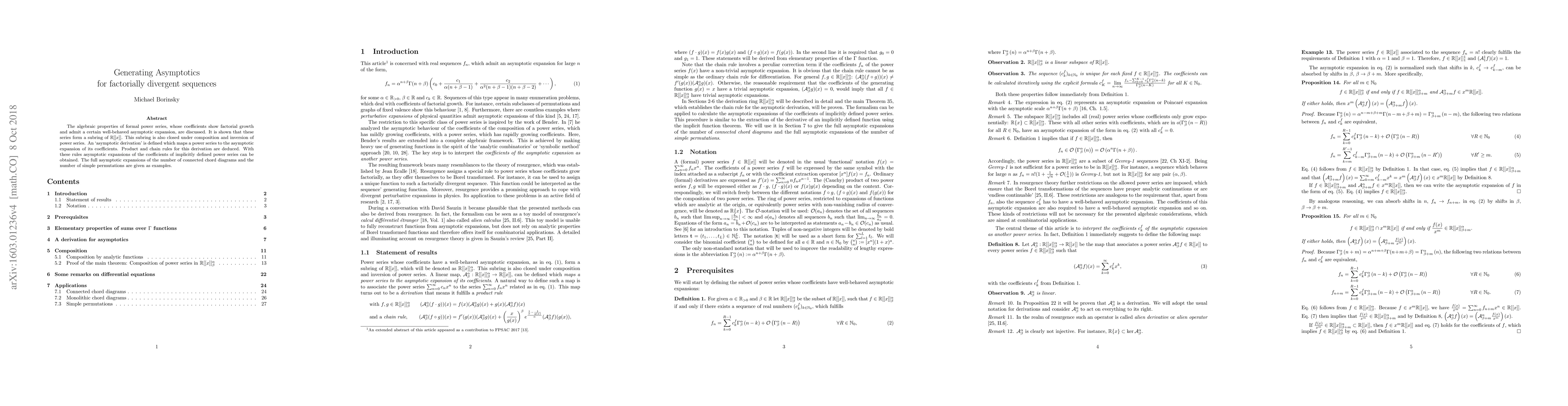 The algebraic properties of formal power series, whose coefficients show factorial growth and admit a certain well-behaved asymptotic expansion, are discussed. It is shown that these series form a subring of $\mathbb{R}[[x]]$. This subring is also closed under composition and inversion of power series. An 'asymptotic derivation' is defined which maps a power series to the asymptotic expansion of its coefficients. Product and chain rules for this derivation are deduced. With these rules asymptotic expansions of the coefficients of implicitly defined power series can be obtained. The full asymptotic expansions of the number of connected chord diagrams and the number of simple permutations are given as examples.
