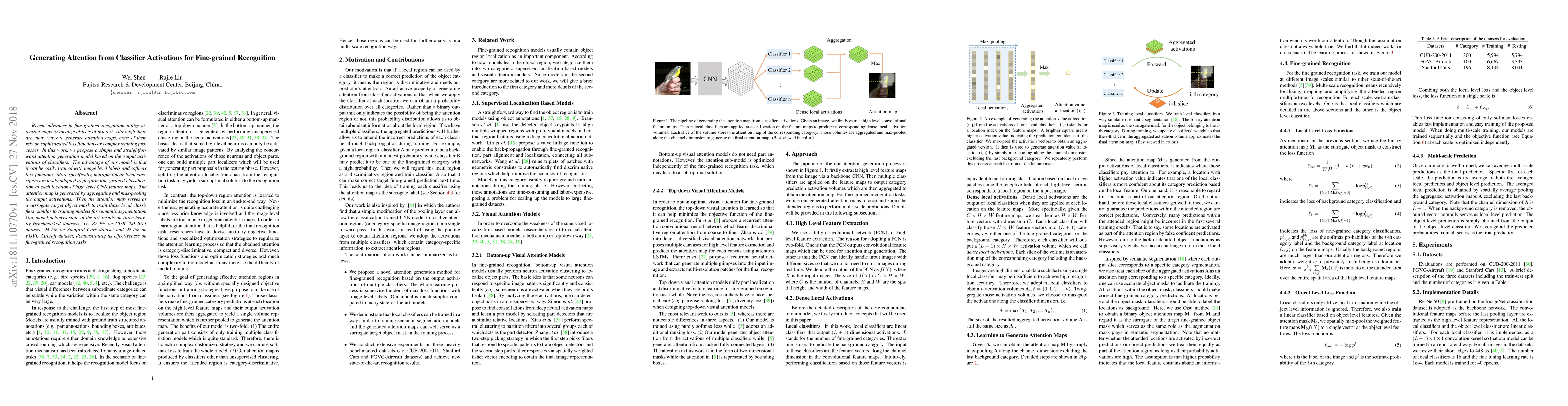 This paper proposes a simple attention generation model based on classifier activations for fine-grained recognition, achieving state-of-the-art results on multiple datasets. The model uses local classifiers on CNN feature maps and trains them using an attention map derived from aggregated activations.