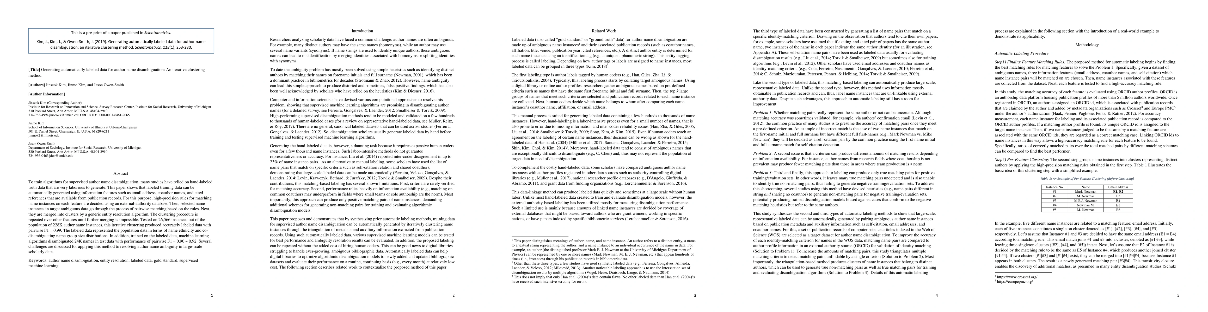 This paper presents an iterative clustering method for automatically generating labeled data to train algorithms for author name disambiguation, achieving high accuracy (pairwise F1 = 0.99). The method uses features like email addresses and co-author names, and it successfully disambiguates 24K names with F1 scores of 0.90-0.92.