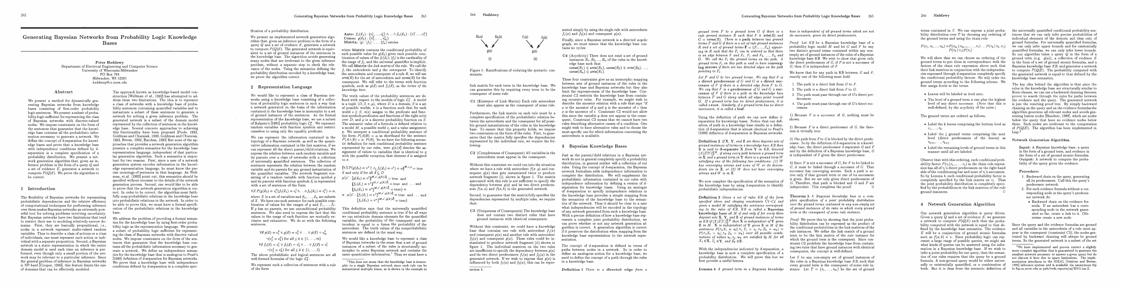 We present a method for dynamically generating Bayesian networks from knowledge bases consisting of first-order probability logic sentences. We present a subset of probability logic sufficient for representing the class of Bayesian networks with discrete-valued nodes. We impose constraints on the form of the sentences that guarantee that the knowledge base contains all the probabilistic information necessary to generate a network. We define the concept of d-separation for knowledge bases and prove that a knowledge base with independence conditions defined by d-separation is a complete specification of a probability distribution. We present a network generation algorithm that, given an inference problem in the form of a query Q and a set of evidence E, generates a network to compute P(Q|E). We prove the algorithm to be correct.