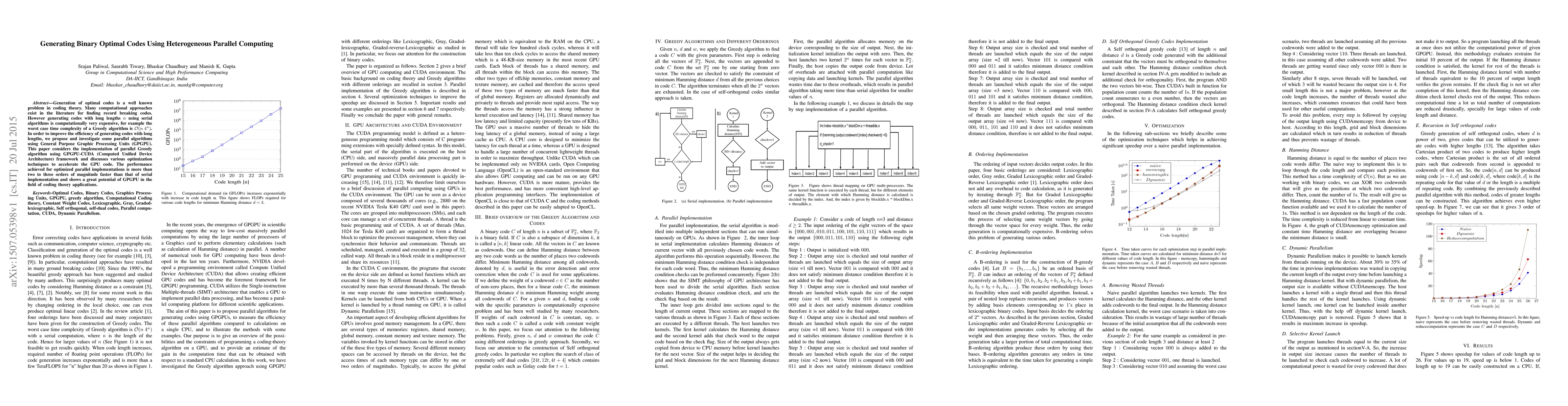This paper proposes parallel algorithms using GPGPU-CUDA to generate optimal binary codes, significantly improving efficiency over serial methods. Optimized parallel implementations achieve performance over two to three orders of magnitude faster than serial algorithms, demonstrating GPGPU's potential in coding theory.