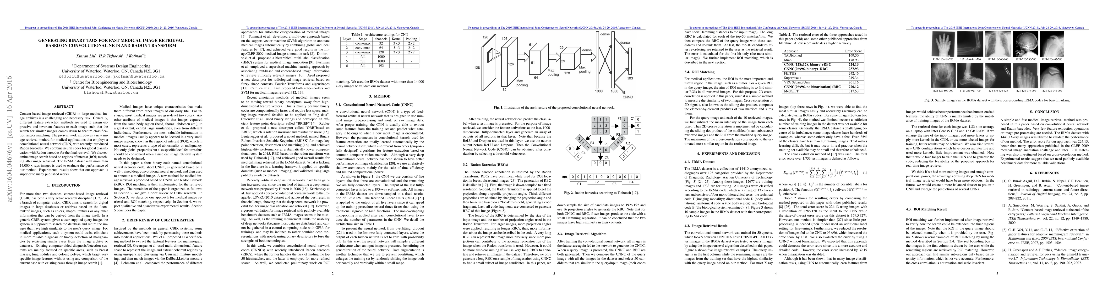 This paper proposes a novel method for fast medical image retrieval using convolutional neural networks (CNNs) and Radon transforms. The method combines CNN-generated global features with Radon barcodes for precise retrieval, and it outperforms existing techniques on the IRMA dataset.