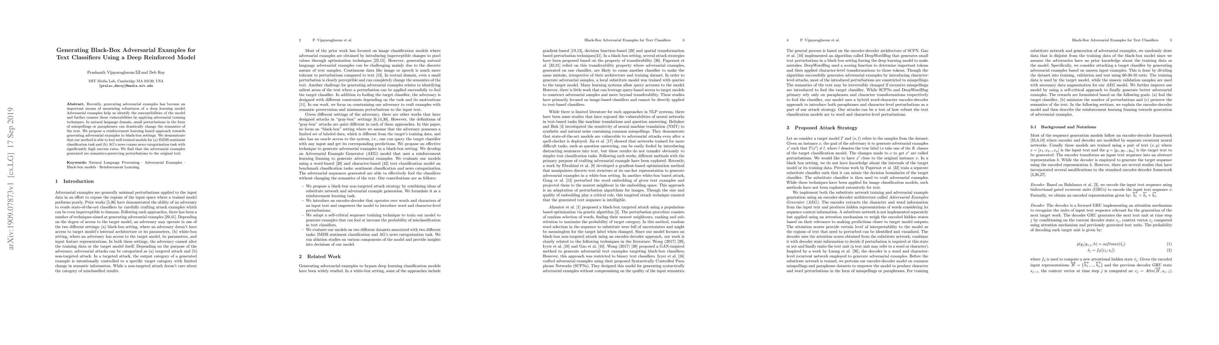 Recently, generating adversarial examples has become an important means of measuring robustness of a deep learning model. Adversarial examples help us identify the susceptibilities of the model and further counter those vulnerabilities by applying adversarial training techniques. In natural language domain, small perturbations in the form of misspellings or paraphrases can drastically change the semantics of the text. We propose a reinforcement learning based approach towards generating adversarial examples in black-box settings. We demonstrate that our method is able to fool well-trained models for (a) IMDB sentiment classification task and (b) AG's news corpus news categorization task with significantly high success rates. We find that the adversarial examples generated are semantics-preserving perturbations to the original text.