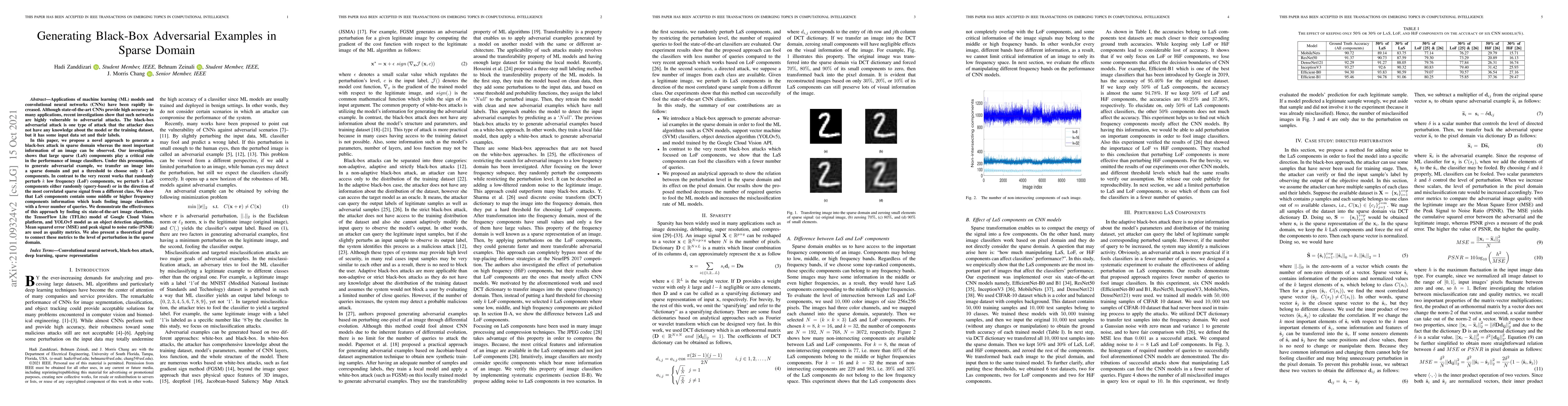 Applications of machine learning (ML) models and convolutional neural networks (CNNs) have been rapidly increased. Although state-of-the-art CNNs provide high accuracy in many applications, recent investigations show that such networks are highly vulnerable to adversarial attacks. The black-box adversarial attack is one type of attack that the attacker does not have any knowledge about the model or the training dataset, but it has some input data set and their labels. In this paper, we propose a novel approach to generate a black-box attack in sparse domain whereas the most important information of an image can be observed. Our investigation shows that large sparse (LaS) components play a critical role in the performance of image classifiers. Under this presumption, to generate adversarial example, we transfer an image into a sparse domain and put a threshold to choose only k LaS components. In contrast to the very recent works that randomly perturb k low frequency (LoF) components, we perturb k LaS components either randomly (query-based) or in the direction of the most correlated sparse signal from a different class. We show that LaS components contain some middle or higher frequency components information which leads fooling image classifiers with a fewer number of queries. We demonstrate the effectiveness of this approach by fooling six state-of-the-art image classifiers, the TensorFlow Lite (TFLite) model of Google Cloud Vision platform, and YOLOv5 model as an object detection algorithm. Mean squared error (MSE) and peak signal to noise ratio (PSNR) are used as quality metrics. We also present a theoretical proof to connect these metrics to the level of perturbation in the sparse domain.