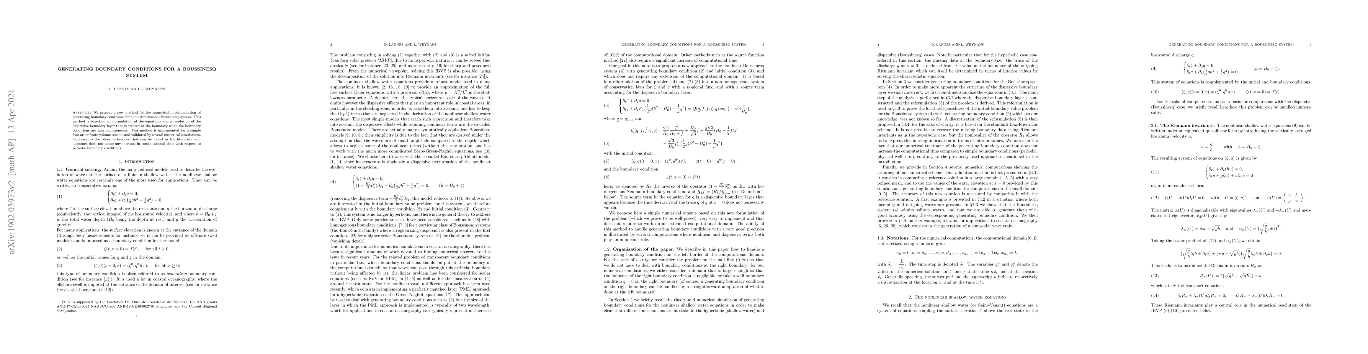 We present a new method for the numerical implementation of generating boundary conditions for a one dimensional Boussinesq system. This method is based on a reformulation of the equations and a resolution of the dispersive boundary layer that is created at the boundary when the boundary conditions are non homogeneous. This method is implemented for a simple first order finite volume scheme and validated by several numerical simulations. Contrary to the other techniques that can be found in the literature, our approach does not cause any increase in computational time with respect to periodic boundary conditions.