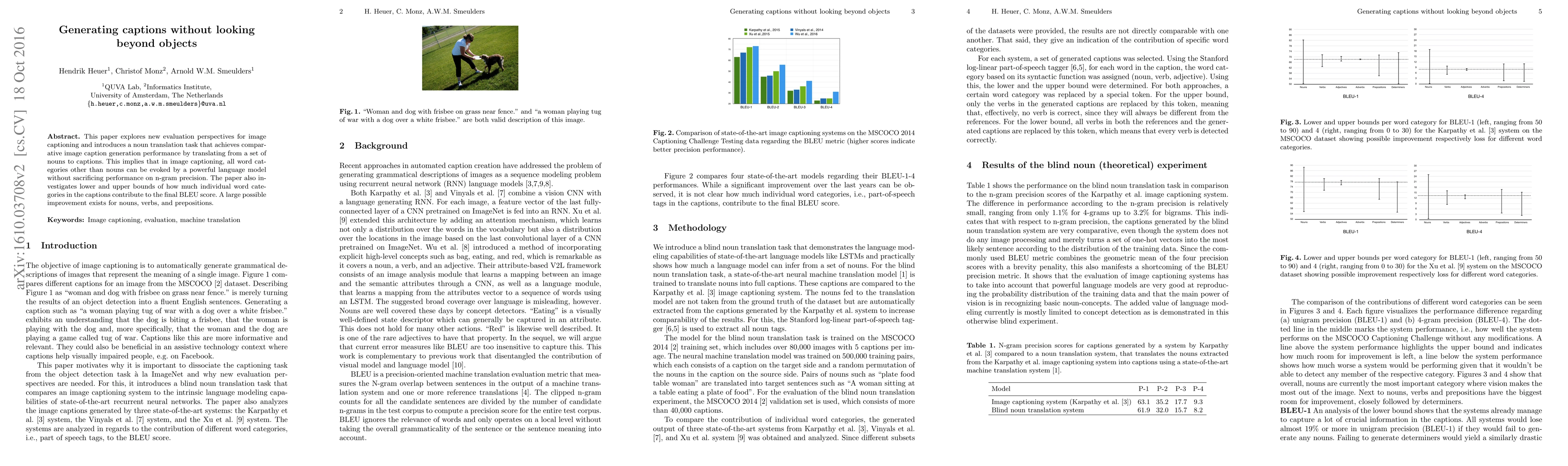 This paper explores new evaluation perspectives for image captioning and introduces a noun translation task that achieves comparative image caption generation performance by translating from a set of nouns to captions. This implies that in image captioning, all word categories other than nouns can be evoked by a powerful language model without sacrificing performance on n-gram precision. The paper also investigates lower and upper bounds of how much individual word categories in the captions contribute to the final BLEU score. A large possible improvement exists for nouns, verbs, and prepositions.