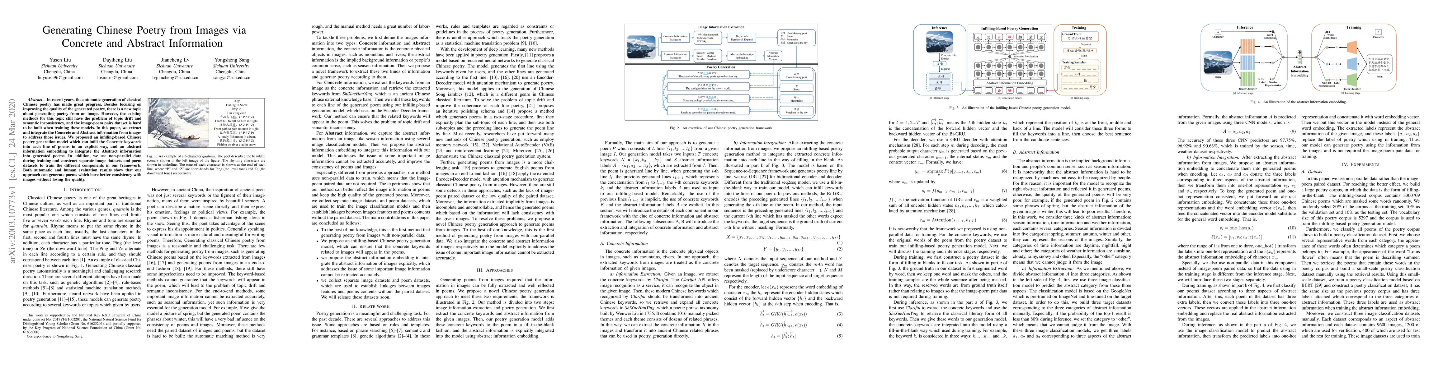 This paper proposes a model for generating classical Chinese poetry from images by extracting Concrete and Abstract information from the images to address issues like topic drift and semantic inconsistency. The infilling-based approach explicitly integrates Concrete keywords, while Abstract information is embedded for consistency, achieving better alignment with images without compromising poetry quality.