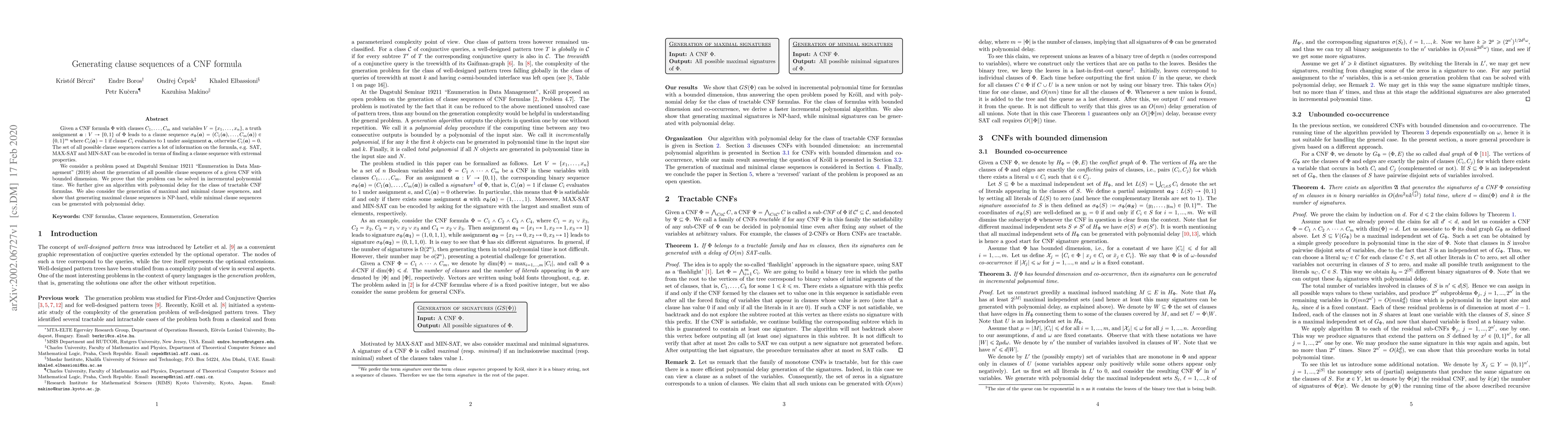 Given a CNF formula $\Phi$ with clauses $C_1,\ldots,C_m$ and variables $V=\{x_1,\ldots,x_n\}$, a truth assignment $a:V\rightarrow\{0,1\}$ of $\Phi$ leads to a clause sequence $\sigma_\Phi(a)=(C_1(a),\ldots,C_m(a))\in\{0,1\}^m$ where $C_i(a) = 1$ if clause $C_i$ evaluates to $1$ under assignment $a$, otherwise $C_i(a) = 0$. The set of all possible clause sequences carries a lot of information on the formula, e.g. SAT, MAX-SAT and MIN-SAT can be encoded in terms of finding a clause sequence with extremal properties. We consider a problem posed at Dagstuhl Seminar 19211 "Enumeration in Data Management" (2019) about the generation of all possible clause sequences of a given CNF with bounded dimension. We prove that the problem can be solved in incremental polynomial time. We further give an algorithm with polynomial delay for the class of tractable CNF formulas. We also consider the generation of maximal and minimal clause sequences, and show that generating maximal clause sequences is NP-hard, while minimal clause sequences can be generated with polynomial delay.