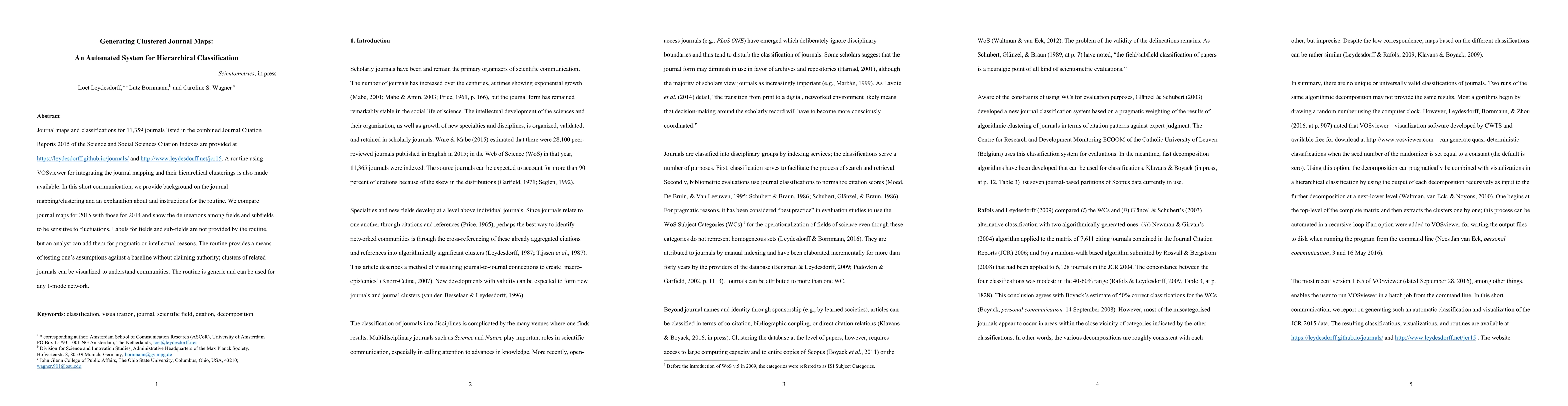 This paper presents an automated system for generating clustered journal maps using VOSviewer, which classifies 11,359 journals from the 2015 Journal Citation Reports. The system visualizes hierarchical clusters and allows for comparison across years, highlighting field delineations' sensitivity to changes.