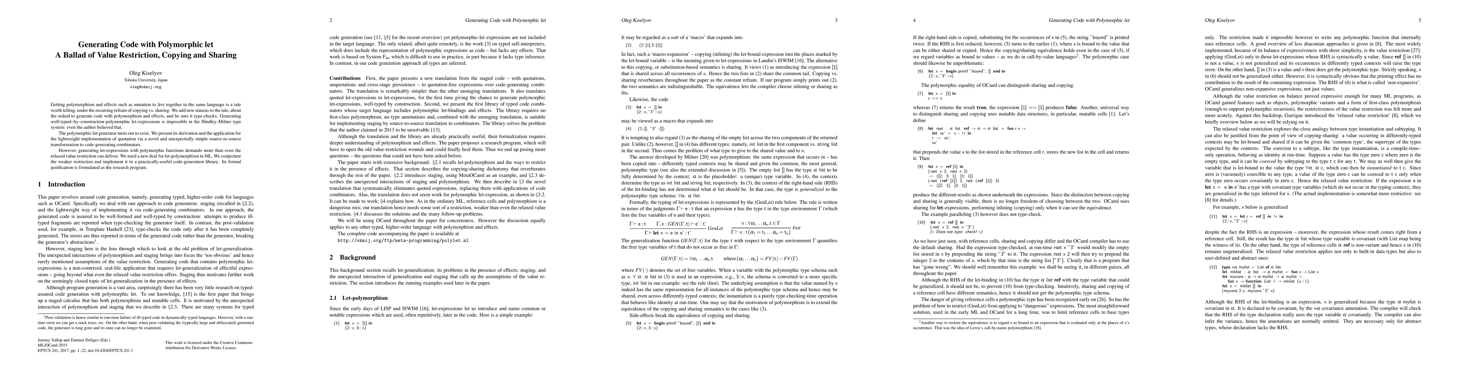 This paper explores the challenge of generating well-typed polymorphic let-expressions within the Hindley-Milner type system, demonstrating that a new, weaker form of value restriction is necessary. It introduces a novel code-generation technique that implements this restriction and provides a practical code-generation library with a formally justified approach.
