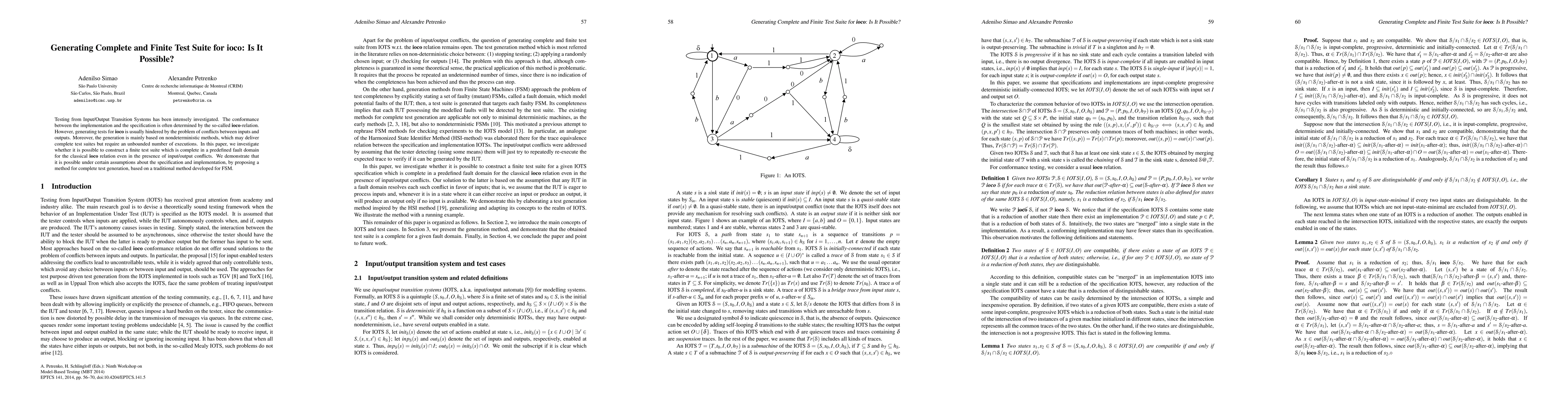 This paper explores the feasibility of generating a finite and complete test suite for the ioco conformance relation, addressing conflicts between inputs and outputs. It proposes a method based on traditional FSM techniques, demonstrating that under certain assumptions, such a test suite can be constructed.