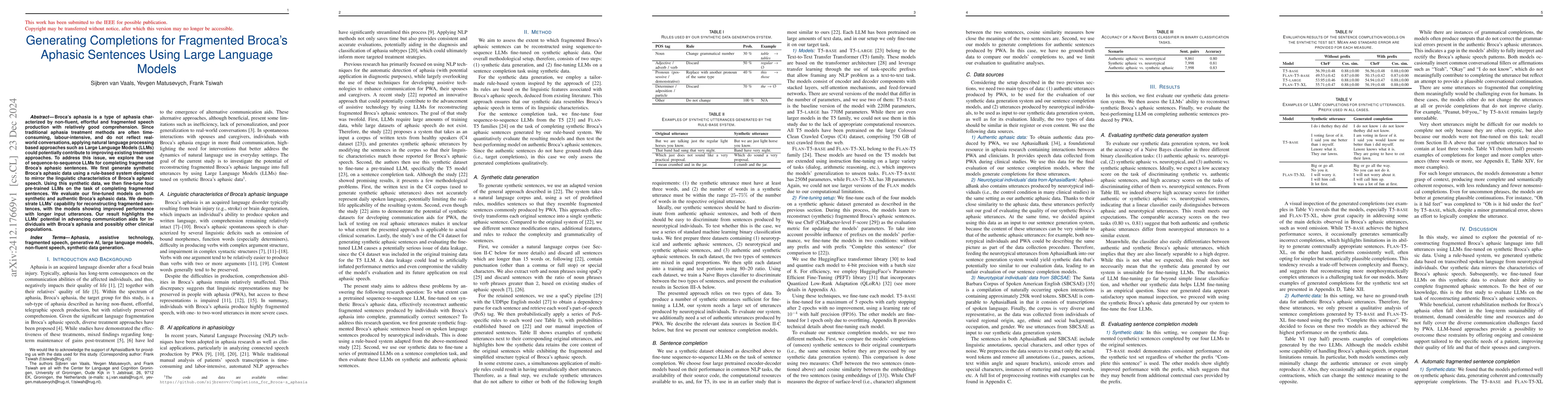 This study investigates using Large Language Models (LLMs) to generate completions for fragmented sentences of Broca's aphasia patients. The authors fine-tune four LLMs on synthetic data mimicking Broca's aphasia speech and evaluate their performance on both synthetic and authentic data, showing the models' potential to aid communication for aphasic individuals.