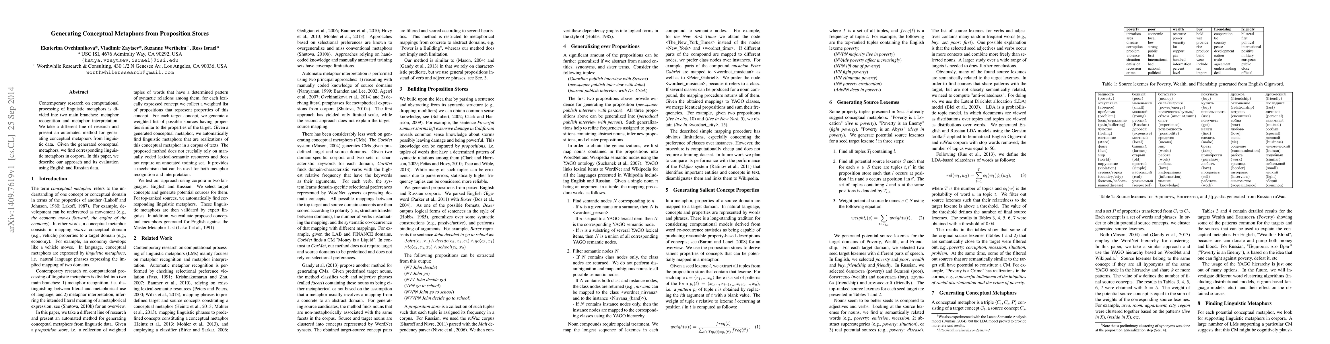 This paper proposes an automated method for generating conceptual metaphors from linguistic data, aiming to bridge metaphor recognition and interpretation. The approach is evaluated using English and Russian corpora to find corresponding linguistic metaphors.