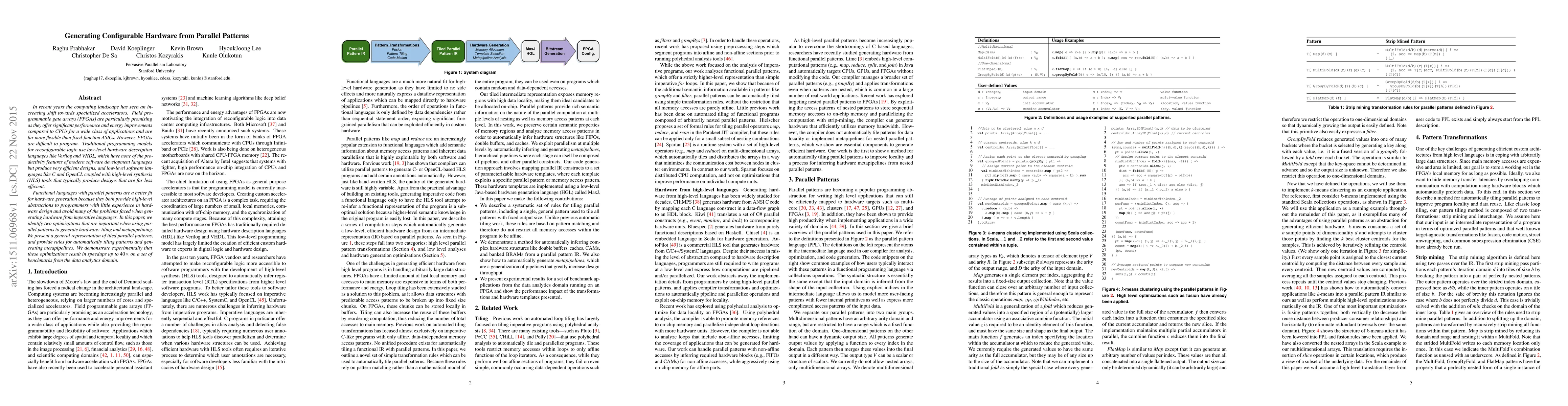 This paper explores generating configurable hardware from parallel patterns using functional languages, identifying tiling and metapipelining as key optimizations for efficient hardware design. Experimental results show up to 40x speedups in data analytics benchmarks.