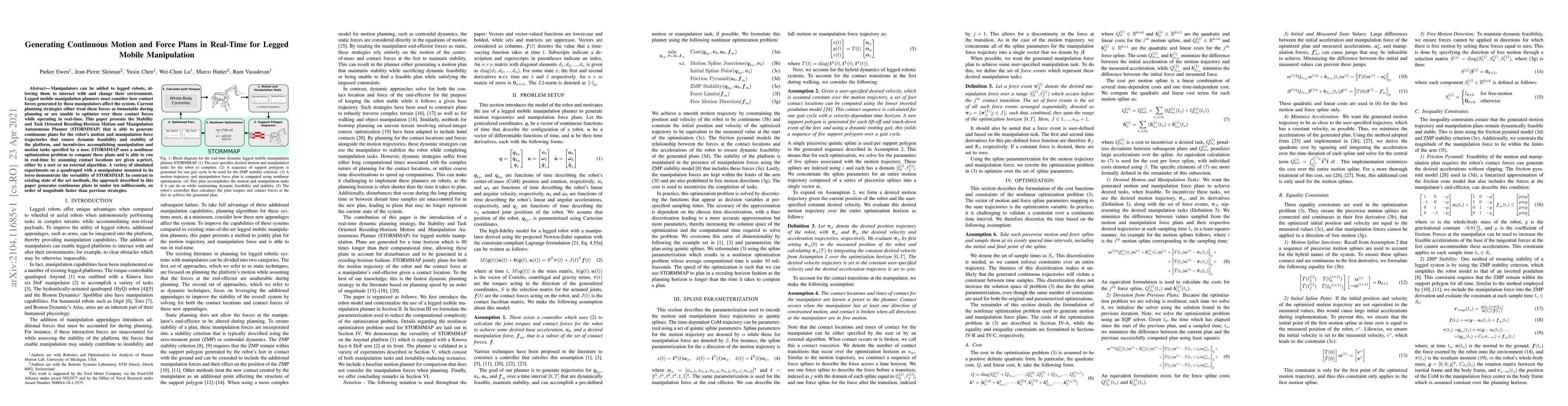 The paper introduces STORMMAP, a real-time planner that generates continuous motion and force plans for legged mobile manipulation, achieving dynamic feasibility and stability in under 10 milliseconds.