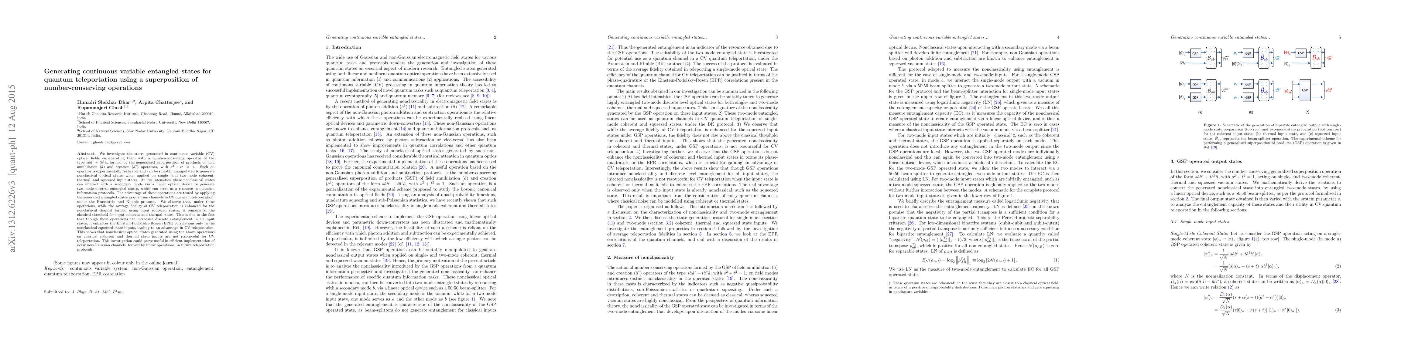 This paper explores the generation of continuous variable entangled states using a superposition of number-conserving operations, demonstrating enhanced fidelity in quantum teleportation when applied to squeezed states. It finds that while these operations can create entangled states from coherent and thermal inputs, only squeezed states provide a significant advantage in CV quantum teleportation.