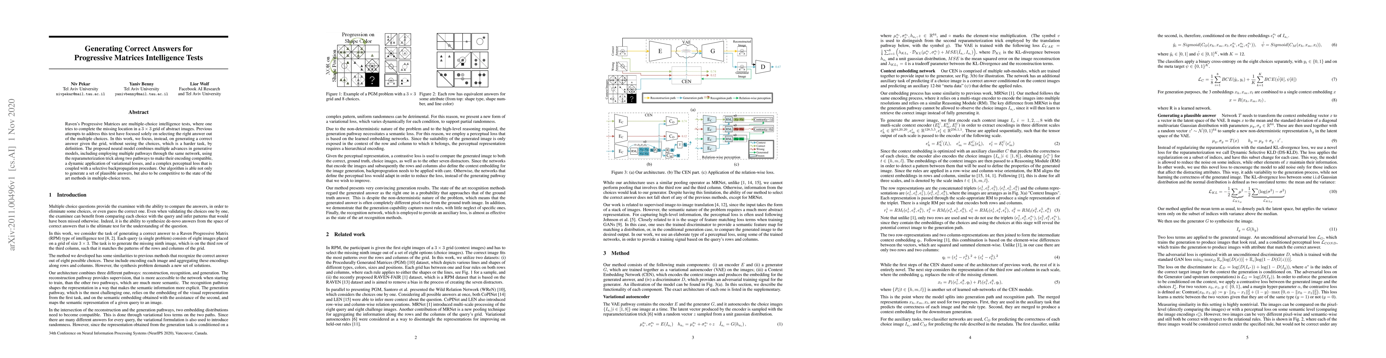 Raven's Progressive Matrices are multiple-choice intelligence tests, where one tries to complete the missing location in a $3\times 3$ grid of abstract images. Previous attempts to address this test have focused solely on selecting the right answer out of the multiple choices. In this work, we focus, instead, on generating a correct answer given the grid, without seeing the choices, which is a harder task, by definition. The proposed neural model combines multiple advances in generative models, including employing multiple pathways through the same network, using the reparameterization trick along two pathways to make their encoding compatible, a dynamic application of variational losses, and a complex perceptual loss that is coupled with a selective backpropagation procedure. Our algorithm is able not only to generate a set of plausible answers, but also to be competitive to the state of the art methods in multiple-choice tests.