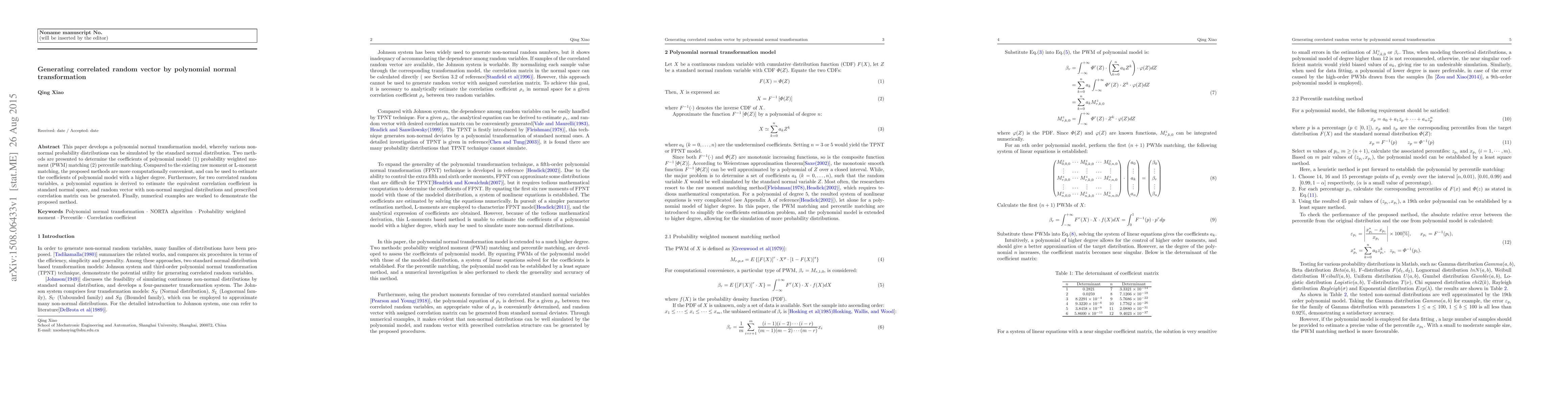 This paper develops a polynomial normal transformation model, whereby various non-normal probability distributions can be simulated by the standard normal distribution. Two methods are presented to determine the coefficients of polynomial model: (1) probability weighted moment (PWM) matching (2) percentile matching. Compared to the existing raw moment or L-moment matching, the proposed methods are more computationally convenient, and can be used to estimate the coefficients of polynomial model with a higher degree. Furthermore, for two correlated random variables, a polynomial equation is derived to estimate the equivalent correlation coefficient in standard normal space, and random vector with non-normal marginal distributions and prescribed correlation matrix can be generated. Finally, numerical examples are worked to demonstrate the proposed method.