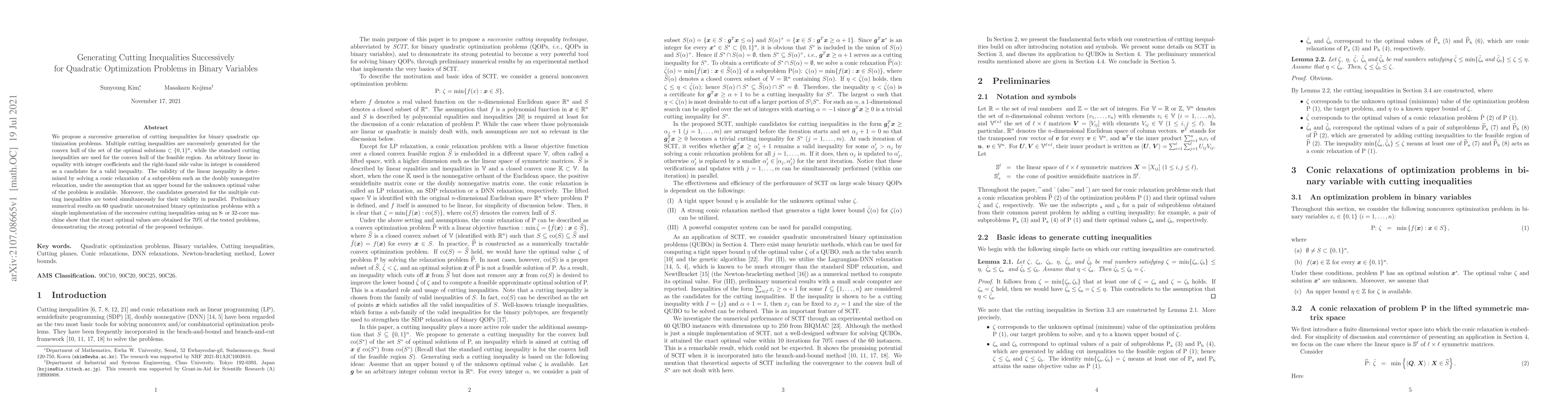 This paper proposes a method for generating successive cutting inequalities to solve binary quadratic optimization problems, achieving exact optimal values for 70% of tested problems. The approach involves generating multiple cutting inequalities in parallel and validating them via conic relaxations.