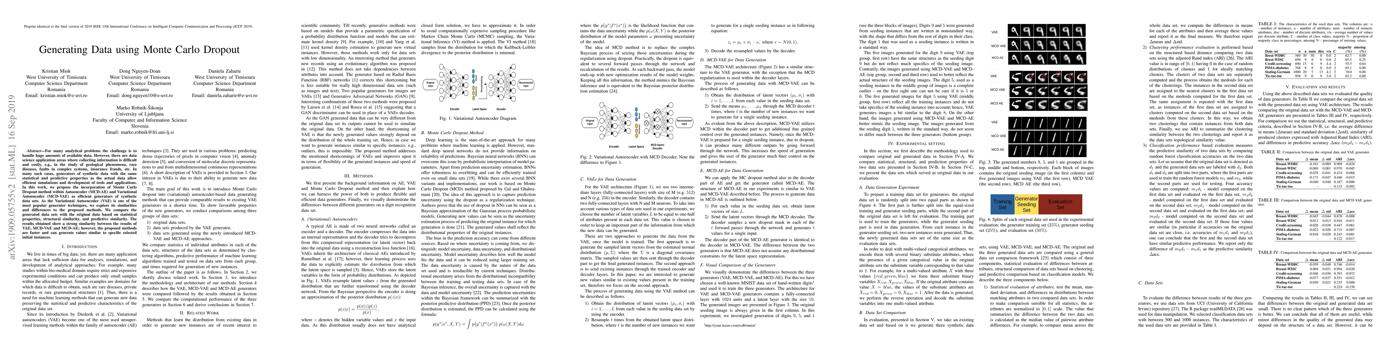 For many analytical problems the challenge is to handle huge amounts of available data. However, there are data science application areas where collecting information is difficult and costly, e.g., in the study of geological phenomena, rare diseases, faults in complex systems, insurance frauds, etc. In many such cases, generators of synthetic data with the same statistical and predictive properties as the actual data allow efficient simulations and development of tools and applications. In this work, we propose the incorporation of Monte Carlo Dropout method within Autoencoder (MCD-AE) and Variational Autoencoder (MCD-VAE) as efficient generators of synthetic data sets. As the Variational Autoencoder (VAE) is one of the most popular generator techniques, we explore its similarities and differences to the proposed methods. We compare the generated data sets with the original data based on statistical properties, structural similarity, and predictive similarity. The results obtained show a strong similarity between the results of VAE, MCD-VAE and MCD-AE; however, the proposed methods are faster and can generate values similar to specific selected initial instances.