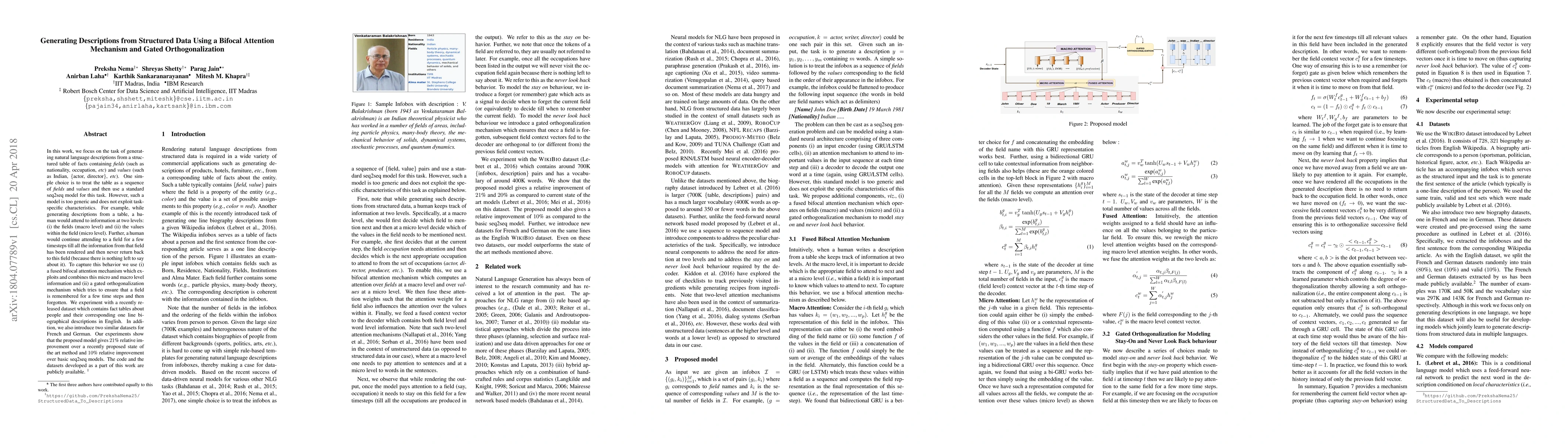 In this work, we focus on the task of generating natural language descriptions from a structured table of facts containing fields (such as nationality, occupation, etc) and values (such as Indian, actor, director, etc). One simple choice is to treat the table as a sequence of fields and values and then use a standard seq2seq model for this task. However, such a model is too generic and does not exploit task-specific characteristics. For example, while generating descriptions from a table, a human would attend to information at two levels: (i) the fields (macro level) and (ii) the values within the field (micro level). Further, a human would continue attending to a field for a few timesteps till all the information from that field has been rendered and then never return back to this field (because there is nothing left to say about it). To capture this behavior we use (i) a fused bifocal attention mechanism which exploits and combines this micro and macro level information and (ii) a gated orthogonalization mechanism which tries to ensure that a field is remembered for a few time steps and then forgotten. We experiment with a recently released dataset which contains fact tables about people and their corresponding one line biographical descriptions in English. In addition, we also introduce two similar datasets for French and German. Our experiments show that the proposed model gives 21% relative improvement over a recently proposed state of the art method and 10% relative improvement over basic seq2seq models. The code and the datasets developed as a part of this work are publicly available.