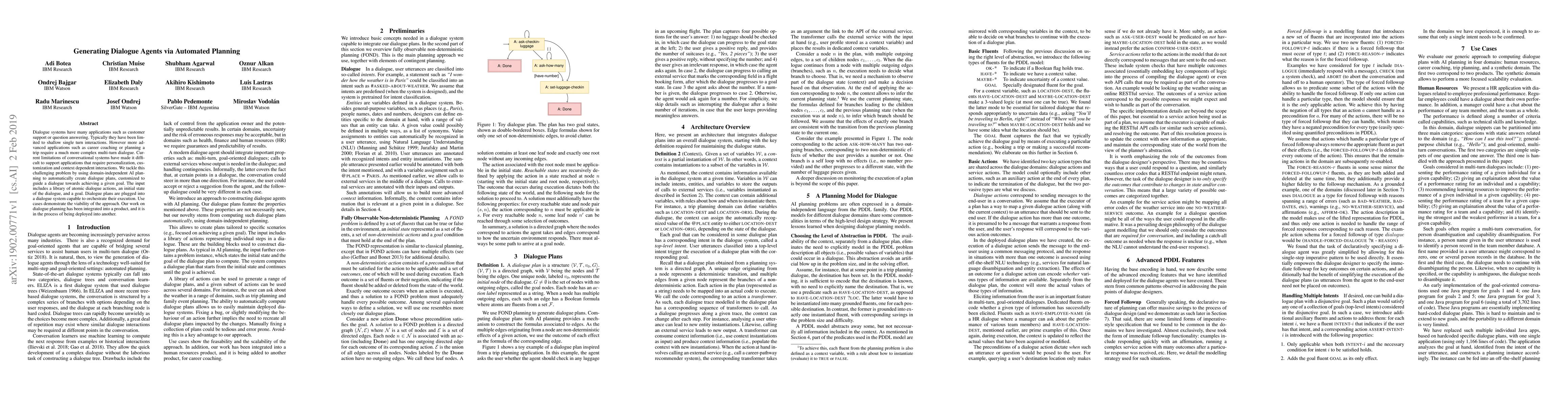 This paper proposes a method for generating complex multi-turn dialogue agents using automated planning to create customized dialogue plans for applications like career coaching. The approach leverages domain-independent AI planning and has been integrated into products for deployment.