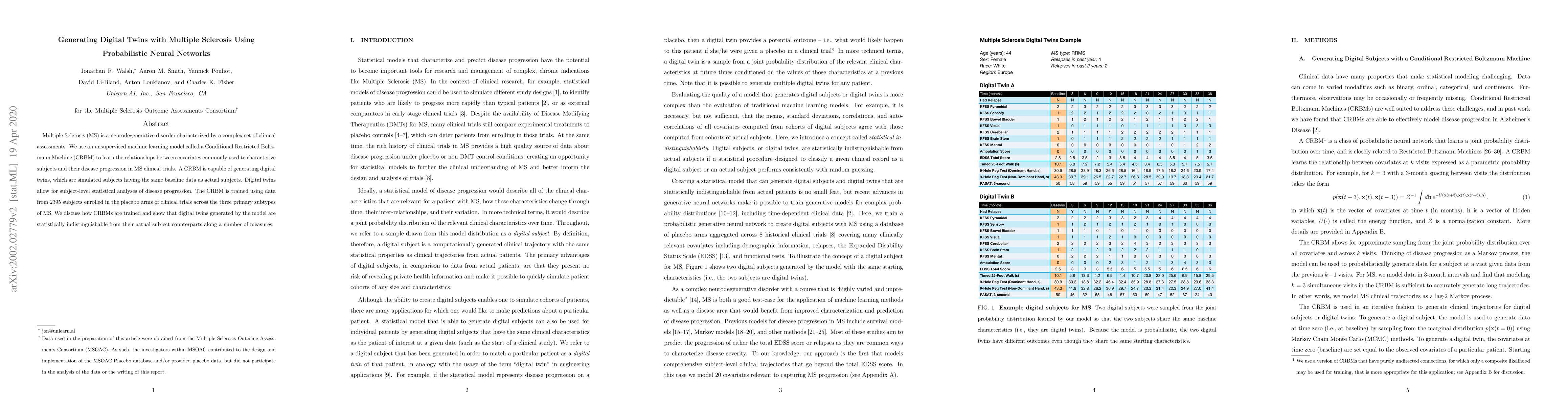 Multiple Sclerosis (MS) is a neurodegenerative disorder characterized by a complex set of clinical assessments. We use an unsupervised machine learning model called a Conditional Restricted Boltzmann Machine (CRBM) to learn the relationships between covariates commonly used to characterize subjects and their disease progression in MS clinical trials. A CRBM is capable of generating digital twins, which are simulated subjects having the same baseline data as actual subjects. Digital twins allow for subject-level statistical analyses of disease progression. The CRBM is trained using data from 2395 subjects enrolled in the placebo arms of clinical trials across the three primary subtypes of MS. We discuss how CRBMs are trained and show that digital twins generated by the model are statistically indistinguishable from their actual subject counterparts along a number of measures.