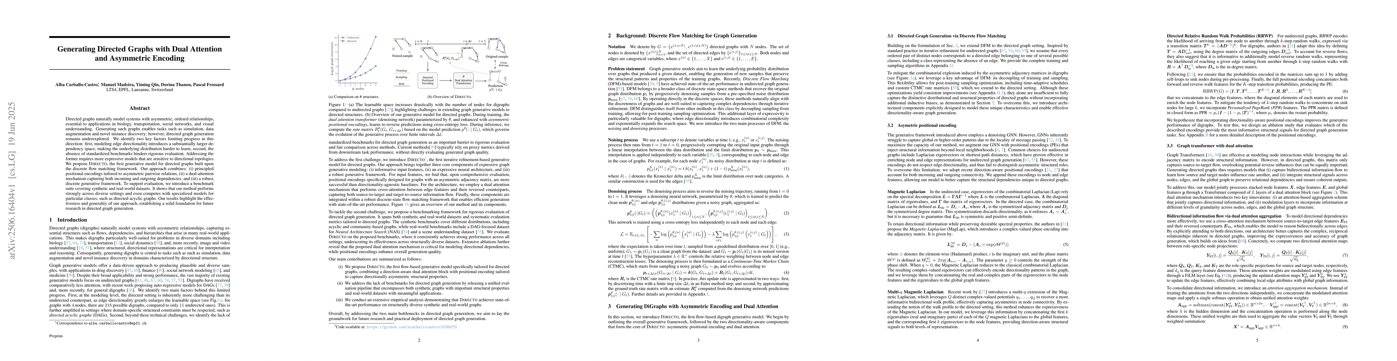 Directed graphs naturally model systems with asymmetric, ordered relationships, essential to applications in biology, transportation, social networks, and visual understanding. Generating such graphs enables tasks such as simulation, data augmentation and novel instance discovery; however, directed graph generation remains underexplored. We identify two key factors limiting progress in this direction: first, modeling edge directionality introduces a substantially larger dependency space, making the underlying distribution harder to learn; second, the absence of standardized benchmarks hinders rigorous evaluation. Addressing the former requires more expressive models that are sensitive to directional topologies. We propose Directo, the first generative model for directed graphs built upon the discrete flow matching framework. Our approach combines: (i) principled positional encodings tailored to asymmetric pairwise relations, (ii) a dual-attention mechanism capturing both incoming and outgoing dependencies, and (iii) a robust, discrete generative framework. To support evaluation, we introduce a benchmark suite covering synthetic and real-world datasets. It shows that our method performs strongly across diverse settings and even competes with specialized models for particular classes, such as directed acyclic graphs. Our results highlight the effectiveness and generality of our approach, establishing a solid foundation for future research in directed graph generation.