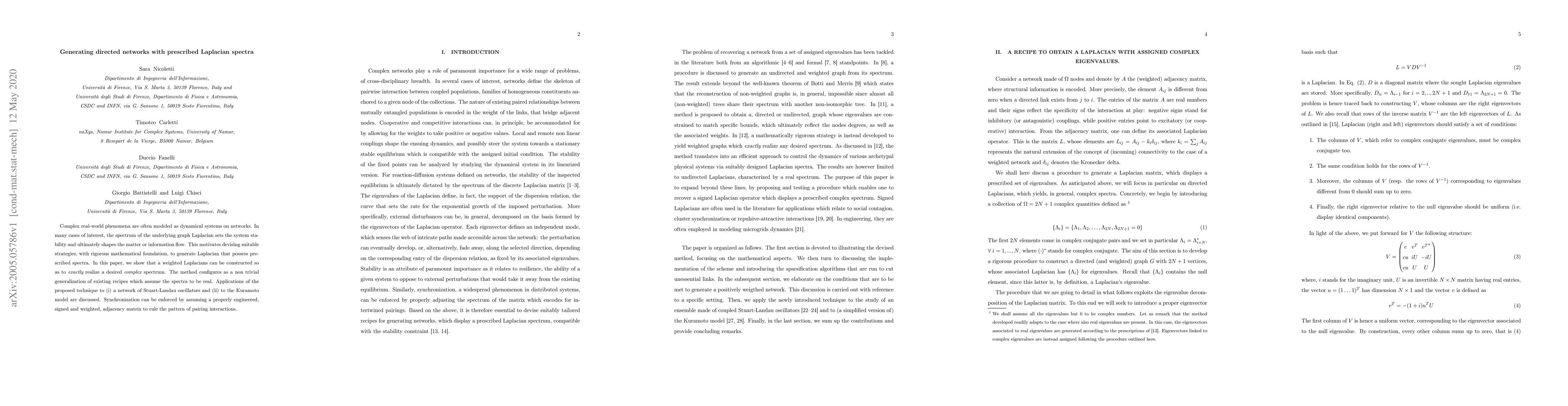 Complex real-world phenomena are often modeled as dynamical systems on networks. In many cases of interest, the spectrum of the underlying graph Laplacian sets the system stability and ultimately shapes the matter or information flow. This motivates devising suitable strategies, with rigorous mathematical foundation, to generate Laplacian that possess prescribed spectra. In this paper, we show that a weighted Laplacians can be constructed so as to exactly realize a desired complex spectrum. The method configures as a non trivial generalization of existing recipes which assume the spectra to be real. Applications of the proposed technique to (i) a network of Stuart-Landau oscillators and (ii) to the Kuramoto model are discussed. Synchronization can be enforced by assuming a properly engineered, signed and weighted, adjacency matrix to rule the pattern of pairing interactions.
