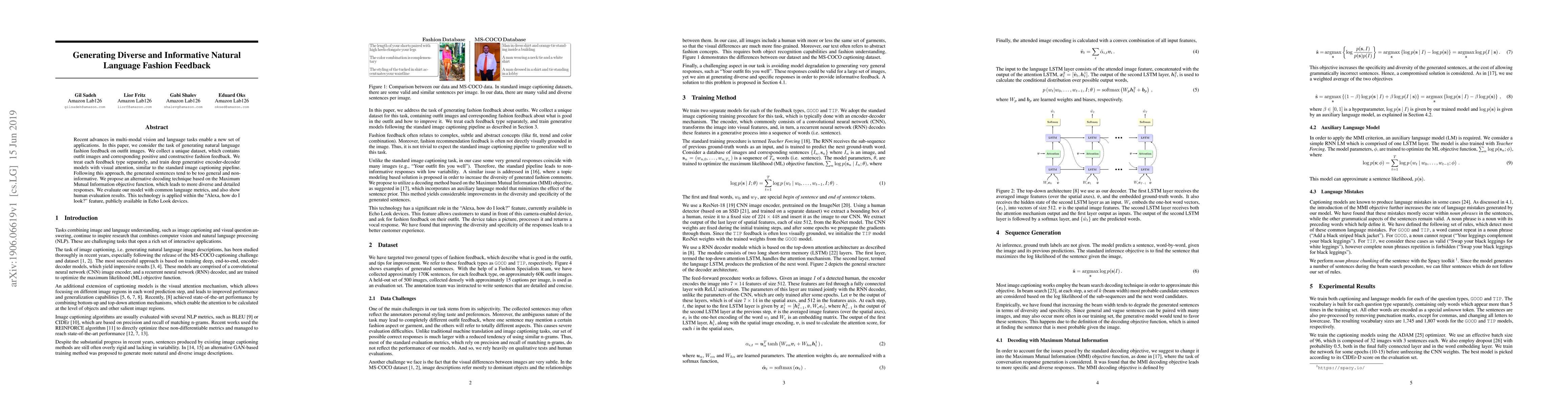 Recent advances in multi-modal vision and language tasks enable a new set of applications. In this paper, we consider the task of generating natural language fashion feedback on outfit images. We collect a unique dataset, which contains outfit images and corresponding positive and constructive fashion feedback. We treat each feedback type separately, and train deep generative encoder-decoder models with visual attention, similar to the standard image captioning pipeline. Following this approach, the generated sentences tend to be too general and non-informative. We propose an alternative decoding technique based on the Maximum Mutual Information objective function, which leads to more diverse and detailed responses. We evaluate our model with common language metrics, and also show human evaluation results. This technology is applied within the ``Alexa, how do I look?'' feature, publicly available in Echo Look devices.