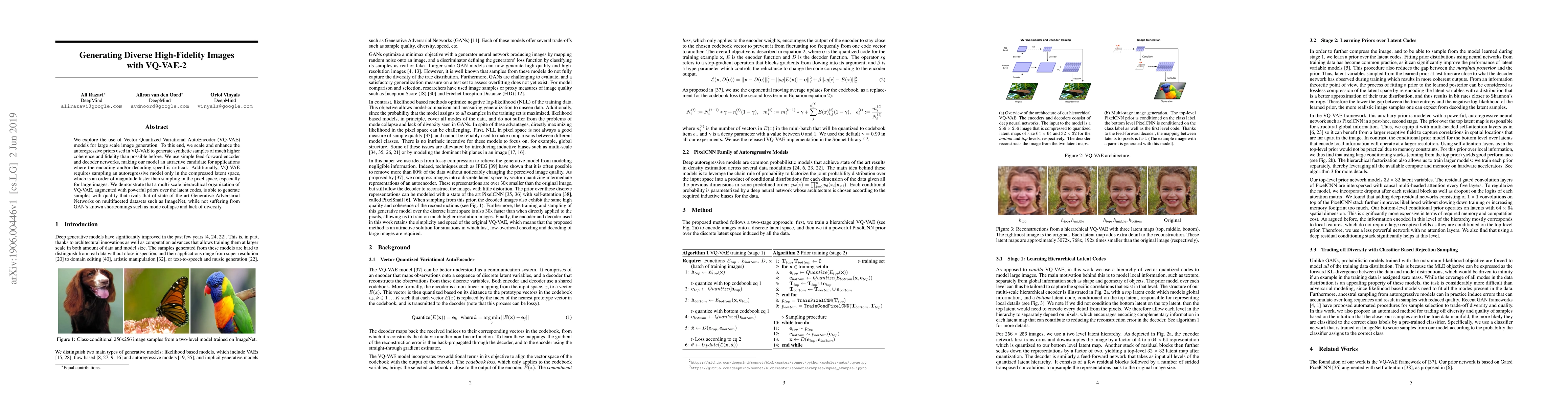 This paper investigates scaling and enhancing VQ-VAE models for high-fidelity image generation, achieving synthetic samples with superior coherence and fidelity. The proposed multi-scale hierarchical VQ-VAE, with fast latent space sampling, generates diverse images comparable to GANs without their drawbacks.