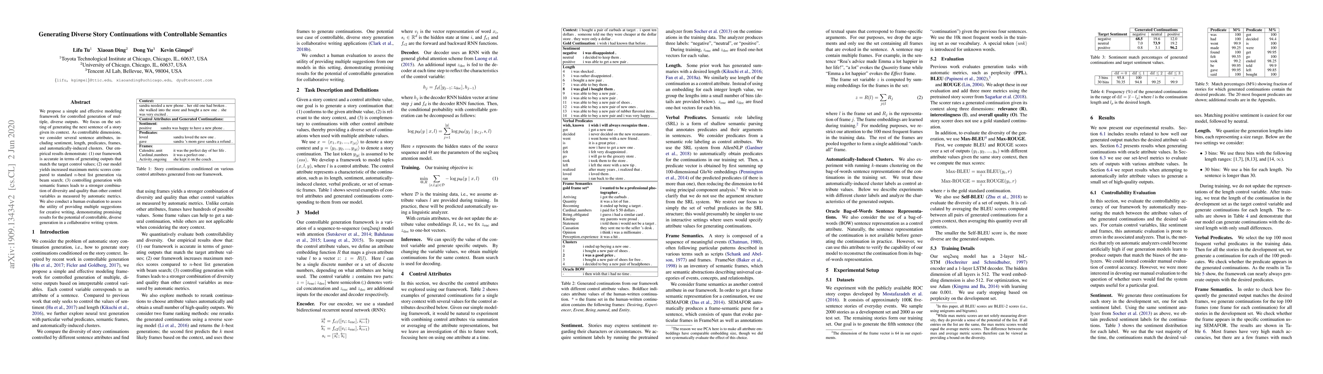 This paper proposes a framework for generating diverse story continuations with controllable semantics, focusing on attributes like sentiment and length. The model outperforms standard methods in generating high-quality, diverse outputs, especially when controlling for semantic frames.