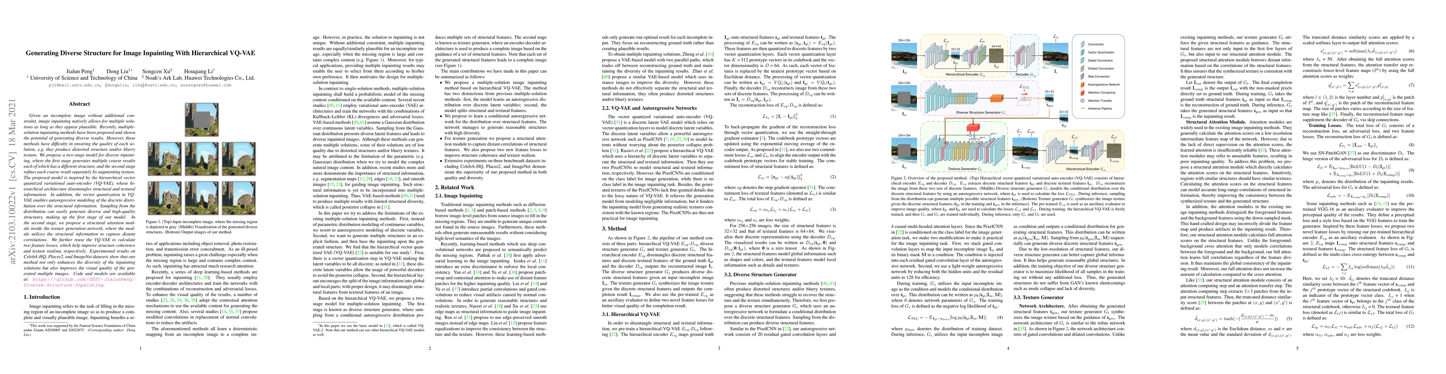 This paper proposes a two-stage model for diverse image inpainting using a hierarchical VQ-VAE, generating multiple high-quality, structurally diverse results by first creating coarse structural variations and then refining textures. The method enhances both diversity and visual quality, as demonstrated on CelebA-HQ, Places2, and ImageNet datasets.