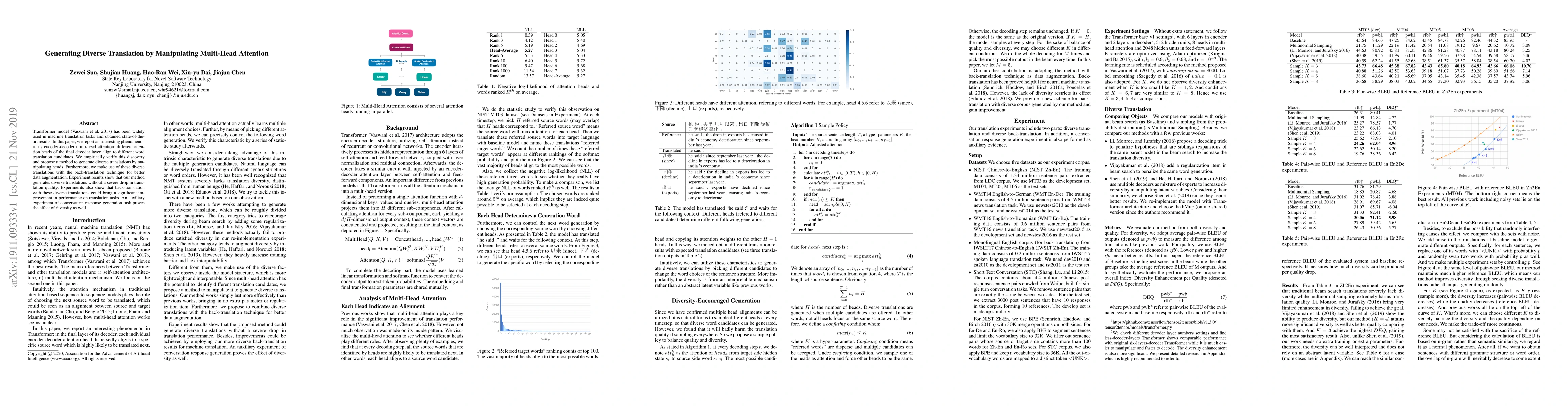 This paper explores how different attention heads in a Transformer model can align to various translation candidates, leading to diverse translations. By manipulating these heads, the authors generate varied translations that enhance back-translation data augmentation, improving overall translation task performance without sacrificing quality.