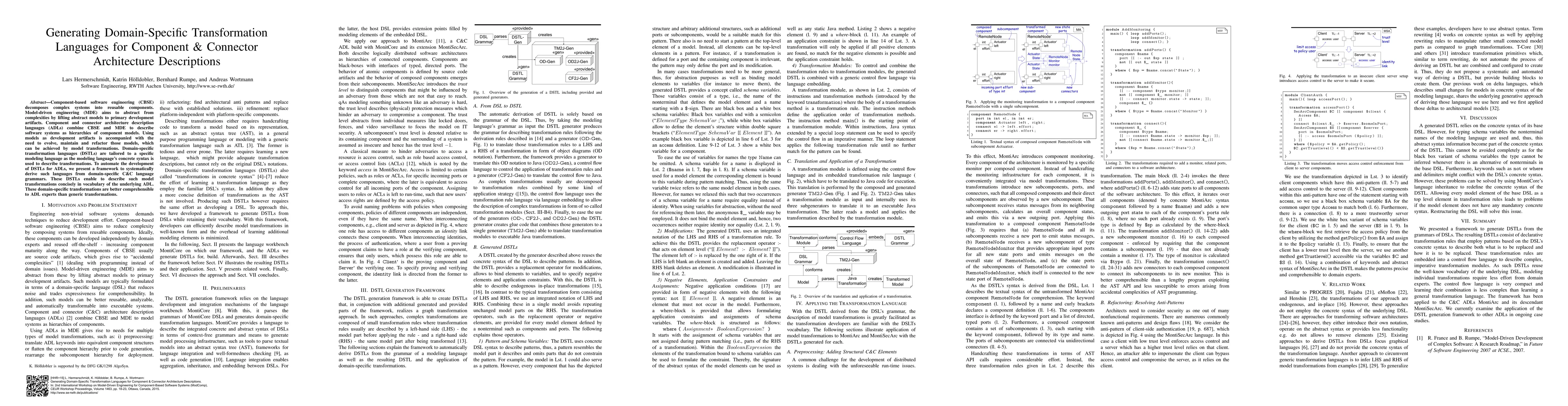 This paper presents a framework for automatically generating domain-specific transformation languages (DSTLs) tailored for component and connector architecture description languages (ADLs). The DSTLs enable concise and comprehensible model transformations using the concrete syntax of the underlying ADL, facilitating easier evolution and maintenance of complex software systems.