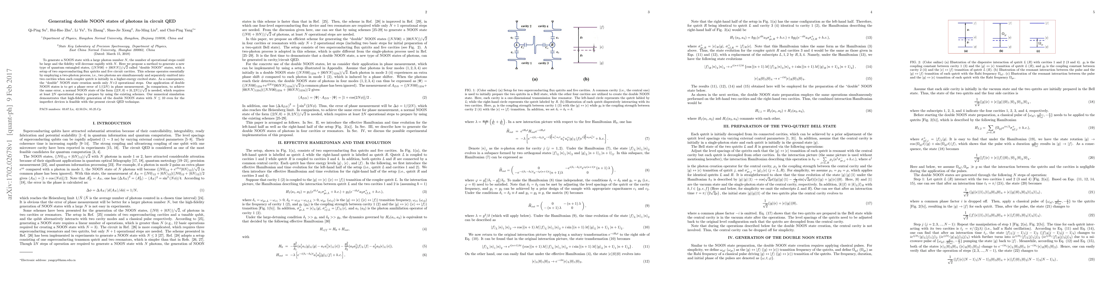 This paper proposes a method to generate "double NOON" states using two superconducting flux qutrits and five circuit cavities, requiring only $N+2$ operational steps compared to $2N$ for normal NOON states. The scheme employs a two-photon process, enabling high-fidelity generation of these states with $N\leq 10$ in circuit QED, with potential applications in phase measurement error reduction.