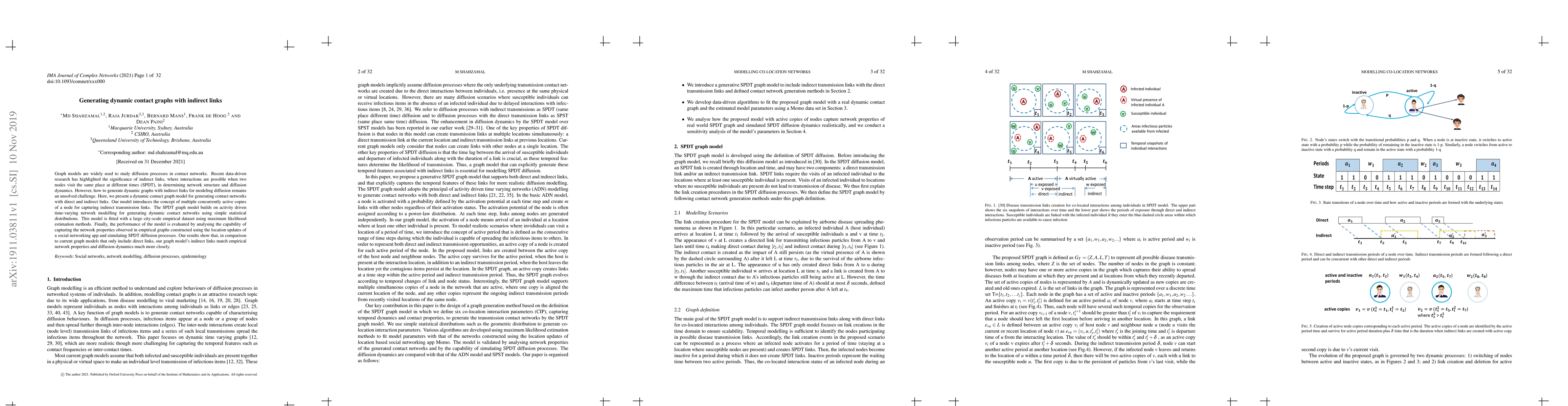 Graph models are widely used to study diffusion processes in contact networks. Recent data-driven research has highlighted the significance of indirect links, where interactions are possible when two nodes visit the same place at different times (SPDT), in determining network structure and diffusion dynamics. However, how to generate dynamic graphs with indirect links for modeling diffusion remains an unsolved challenge. Here, we present a dynamic contact graph model for generating contact networks with direct and indirect links. Our model introduces the concept of multiple concurrently active copies of a node for capturing indirect transmission links. The SPDT graph model builds on activity driven time-varying network modelling for generating dynamic contact networks using simple statistical distributions. This model is fitted with a large city-scale empirical dataset using maximum likelihood estimation methods. Finally, the performance of the model is evaluated by analysing the capability of capturing the network properties observed in empirical graphs constructed using the location updates of a social networking app and simulating SPDT diffusion processes. Our results show that, in comparison to current graph models that only include direct links, our graph model with indirect links match empirical network properties and diffusion dynamics much more closely.