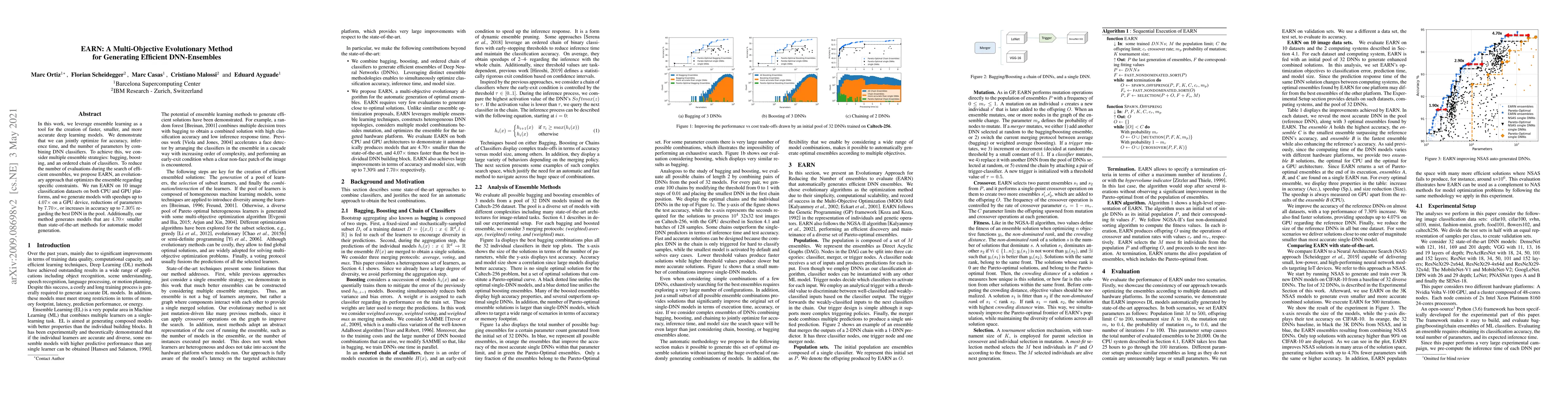 In this work, we leverage ensemble learning as a tool for the creation of faster, smaller, and more accurate deep learning models. We demonstrate that we can jointly optimize for accuracy, inference time, and the number of parameters by combining DNN classifiers. To achieve this, we combine multiple ensemble strategies: bagging, boosting, and an ordered chain of classifiers. To reduce the number of DNN ensemble evaluations during the search, we propose EARN, an evolutionary approach that optimizes the ensemble according to three objectives regarding the constraints specified by the user. We run EARN on 10 image classification datasets with an initial pool of 32 state-of-the-art DCNN on both CPU and GPU platforms, and we generate models with speedups up to $7.60\times$, reductions of parameters by $10\times$, or increases in accuracy up to $6.01\%$ regarding the best DNN in the pool. In addition, our method generates models that are $5.6\times$ faster than the state-of-the-art methods for automatic model generation.