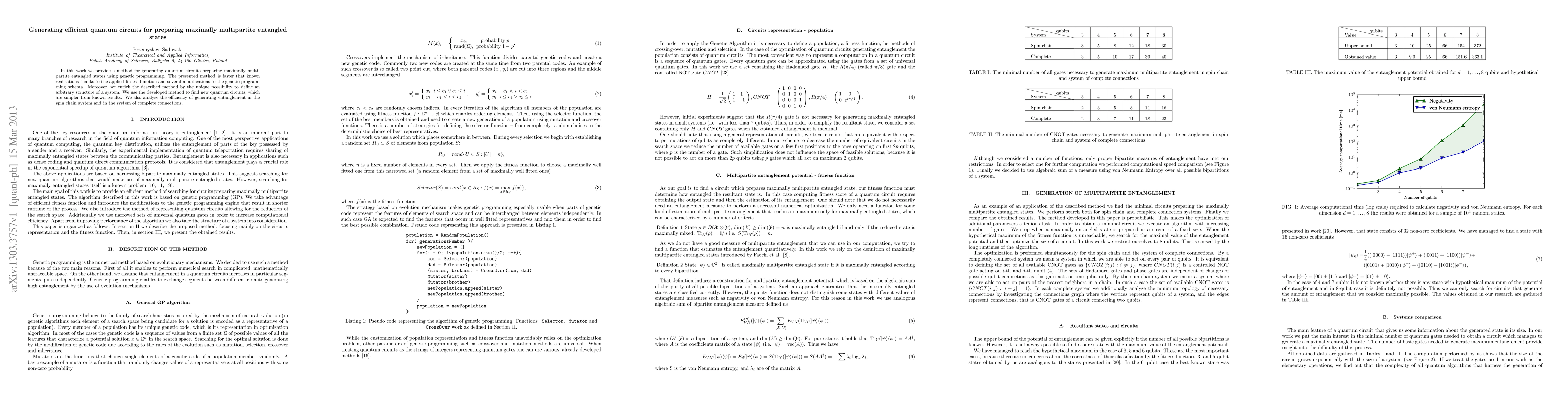 In this work we provide a method for generating quantum circuits preparing maximally multipartite entangled states using genetic programming. The presented method is faster that known realisations thanks to the applied fitness function and several modifications to the genetic programming schema. Moreover, we enrich the described method by the unique possibility to define an arbitrary structure of a system. We use the developed method to find new quantum circuits, which are simpler from known results. We also analyse the efficiency of generating entanglement in the spin chain system and in the system of complete connections.