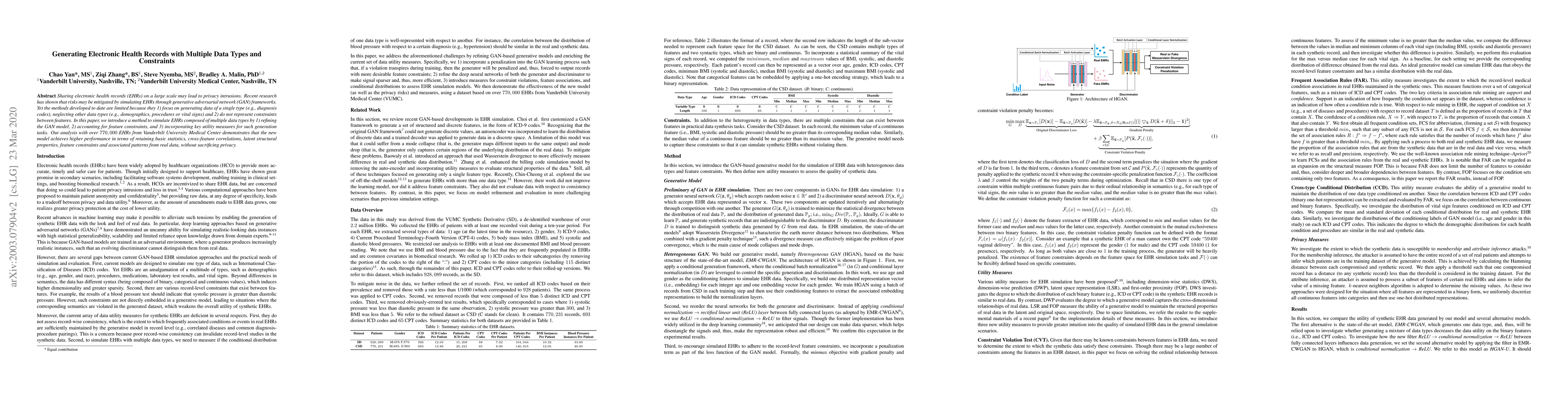 Sharing electronic health records (EHRs) on a large scale may lead to privacy intrusions. Recent research has shown that risks may be mitigated by simulating EHRs through generative adversarial network (GAN) frameworks. Yet the methods developed to date are limited because they 1) focus on generating data of a single type (e.g., diagnosis codes), neglecting other data types (e.g., demographics, procedures or vital signs) and 2) do not represent constraints between features. In this paper, we introduce a method to simulate EHRs composed of multiple data types by 1) refining the GAN model, 2) accounting for feature constraints, and 3) incorporating key utility measures for such generation tasks. Our analysis with over $770,000$ EHRs from Vanderbilt University Medical Center demonstrates that the new model achieves higher performance in terms of retaining basic statistics, cross-feature correlations, latent structural properties, feature constraints and associated patterns from real data, without sacrificing privacy.