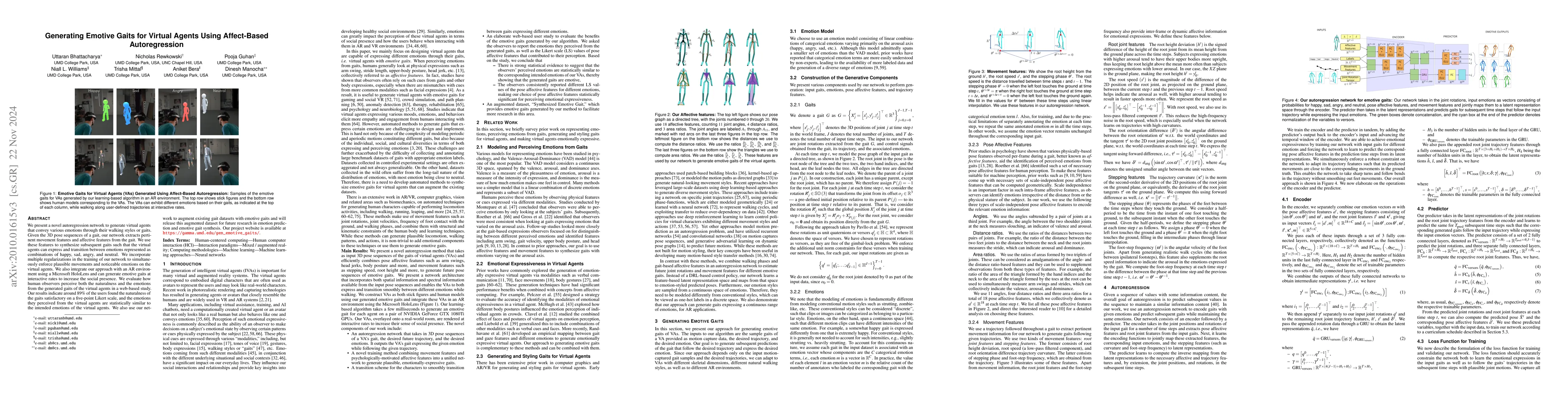 This paper introduces an autoregression network to generate emotive gaits for virtual agents, synthesizing walking styles that convey emotions like happy, sad, angry, and neutral. The network extracts and uses movement and affective features to create plausible and emotionally expressive gaits, achieving satisfactory naturalness and emotion perception according to human observers.