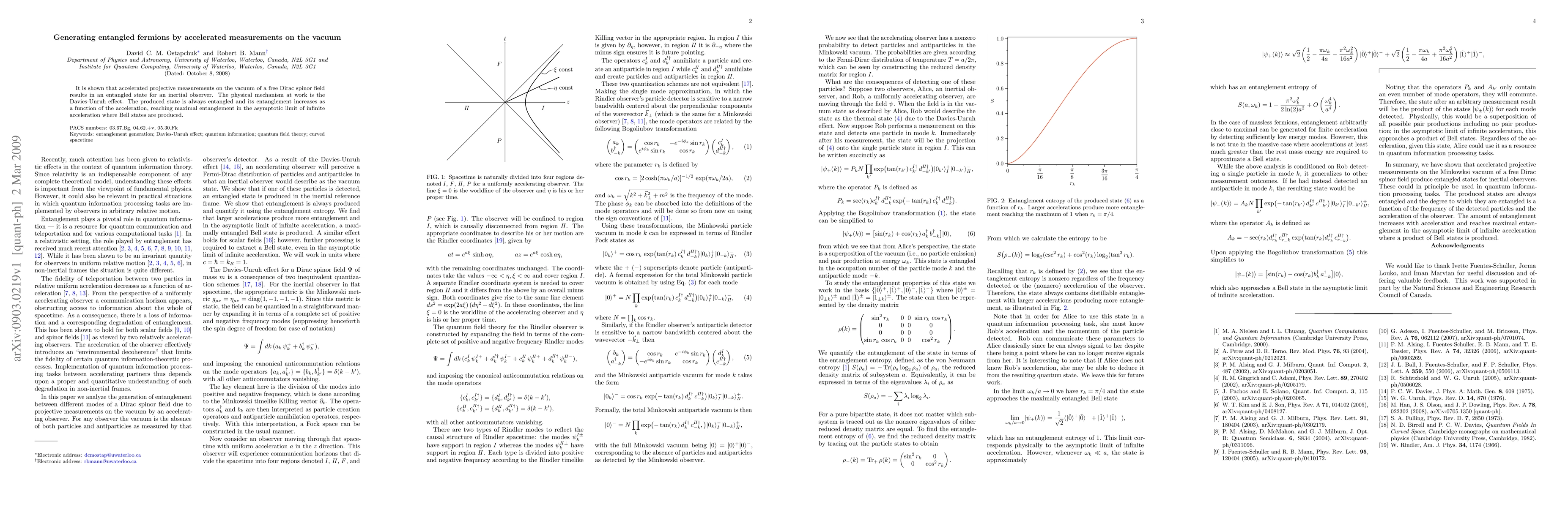 The paper demonstrates that accelerated measurements on the vacuum of a Dirac spinor field produce entangled states for inertial observers, quantified by entanglement entropy, which increases with acceleration.